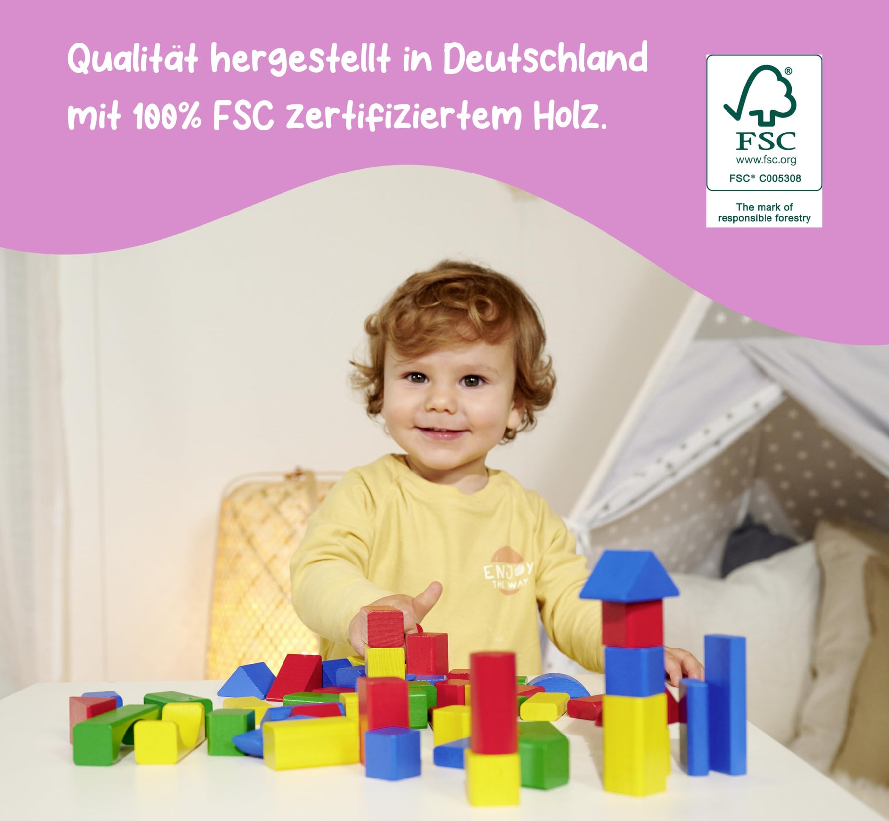 • Hochwertig und sicher – Gefertigt aus FSC 100% zertifiziertem Buchenholz, sind die Bausteine langlebig, stabil und ideal für kleine Hände geeignet.