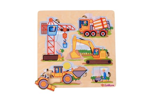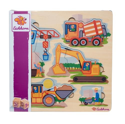 Eichhorn – Baufahrzeuge Puzzle mit 12 Teilen, ideal für kleine Baumeister ab 2 Jahren, farbenfrohe Motive zur Förderung der Feinmotorik, 22,5x22,5 cm groß, aus 100% FSC zertifiziertem Pappelsperrholz