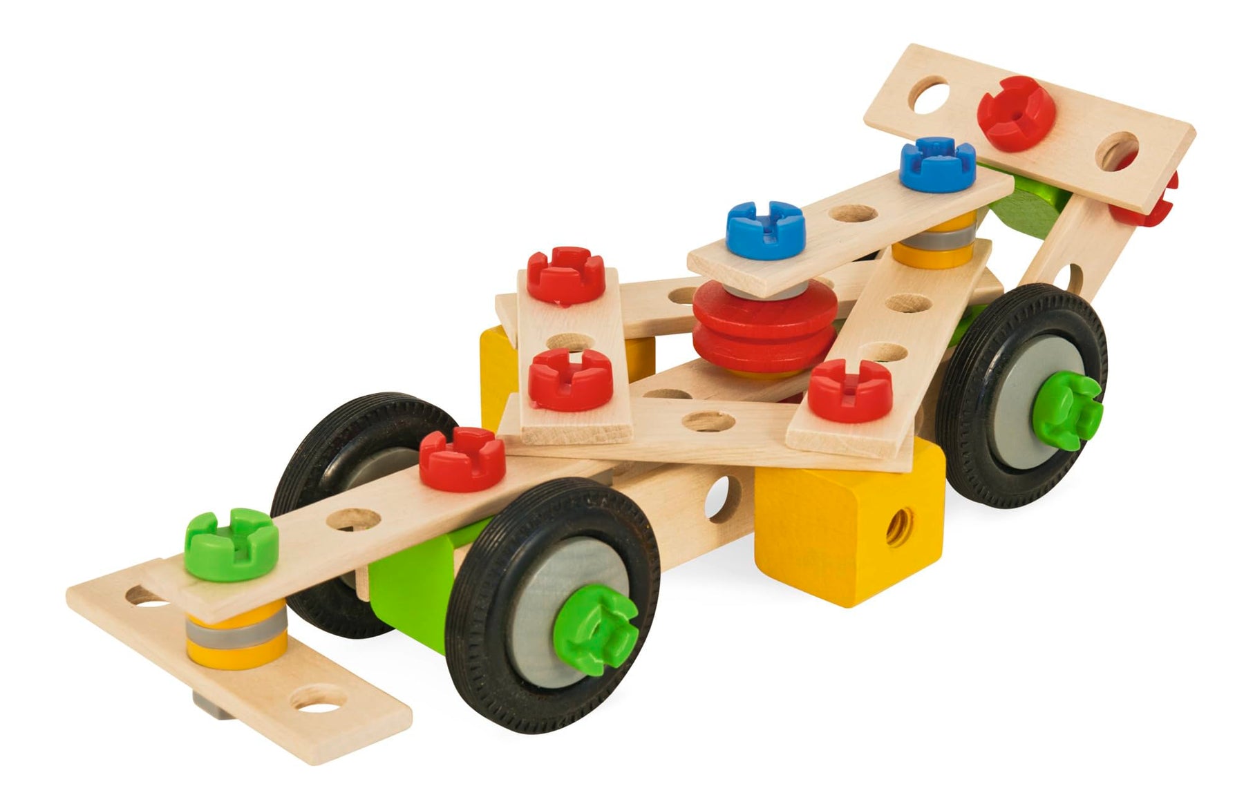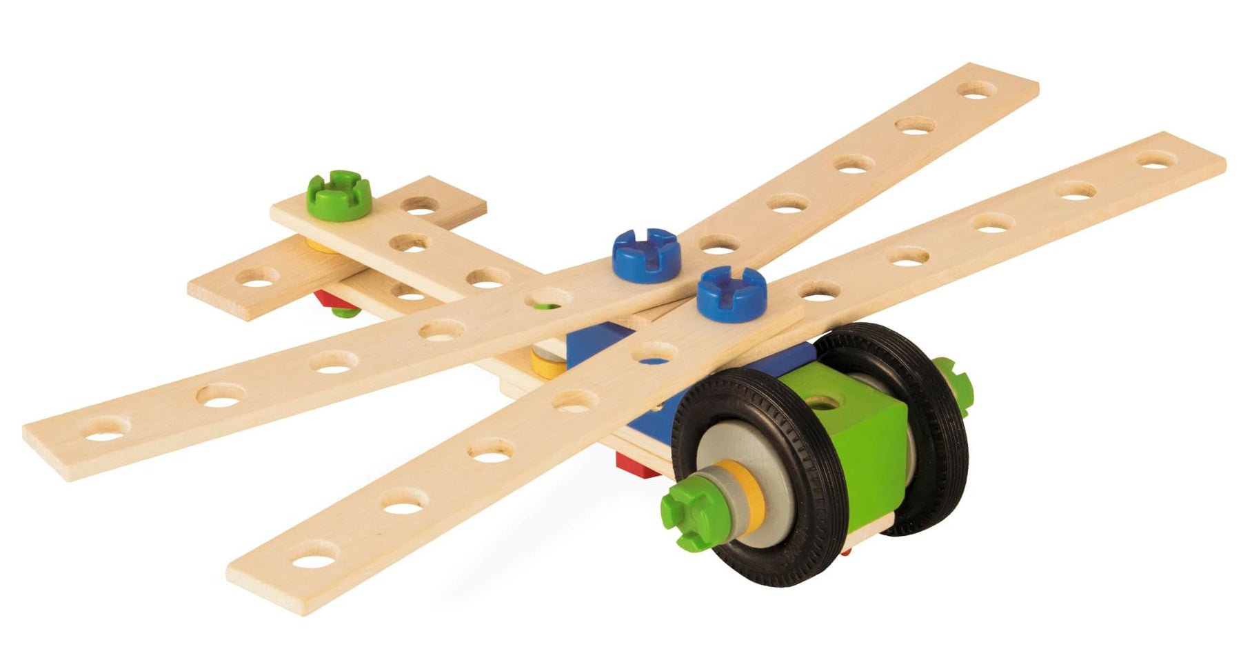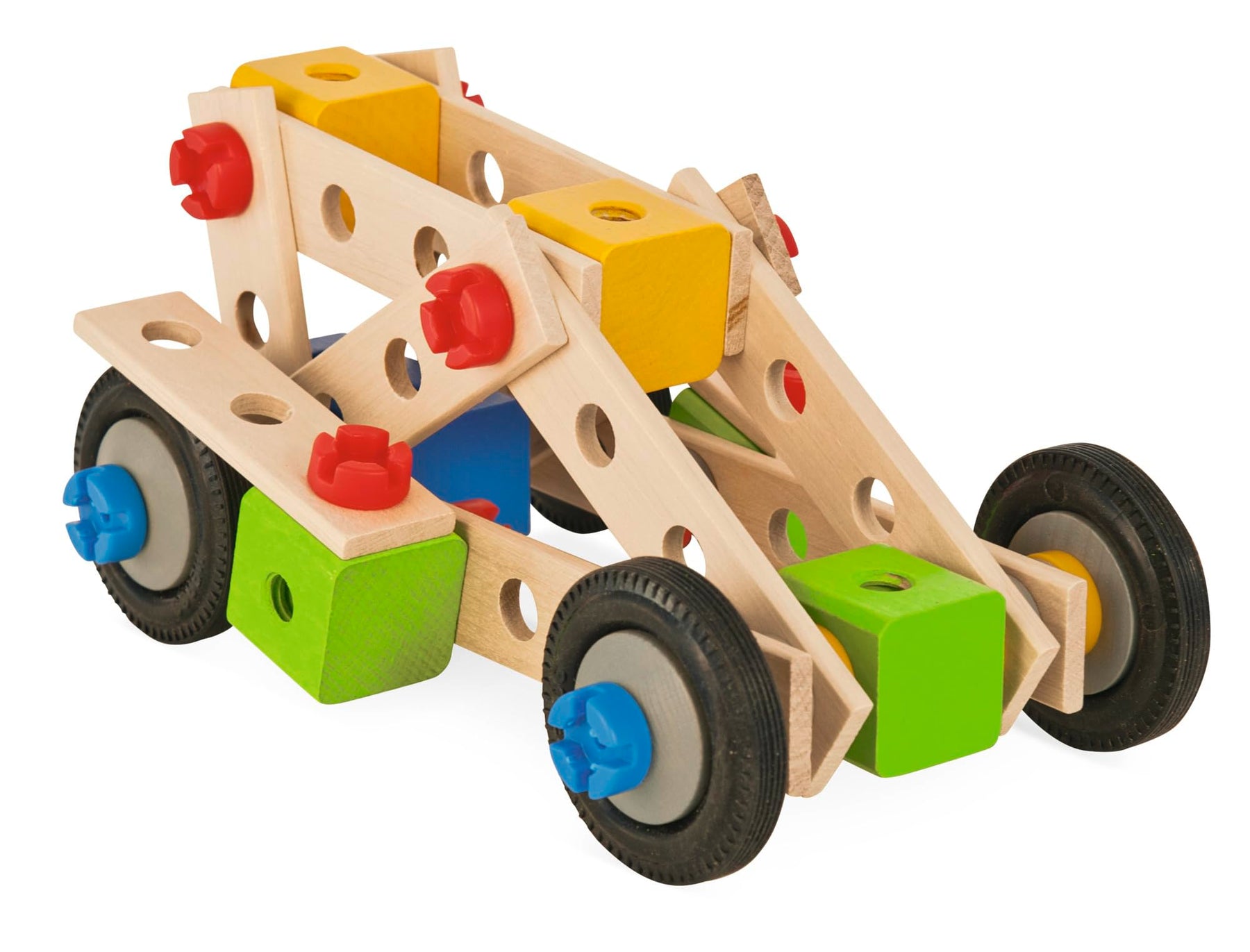 - 90 Teile Set – Mittels der kindgerechten Anleitung können aus den 90 Klötzen, Leisten, Rädern, Schrauben und Muttern mit Geschick neue Fahrzeuge und andere Modelle spielend leicht zusammengebaut werden.
