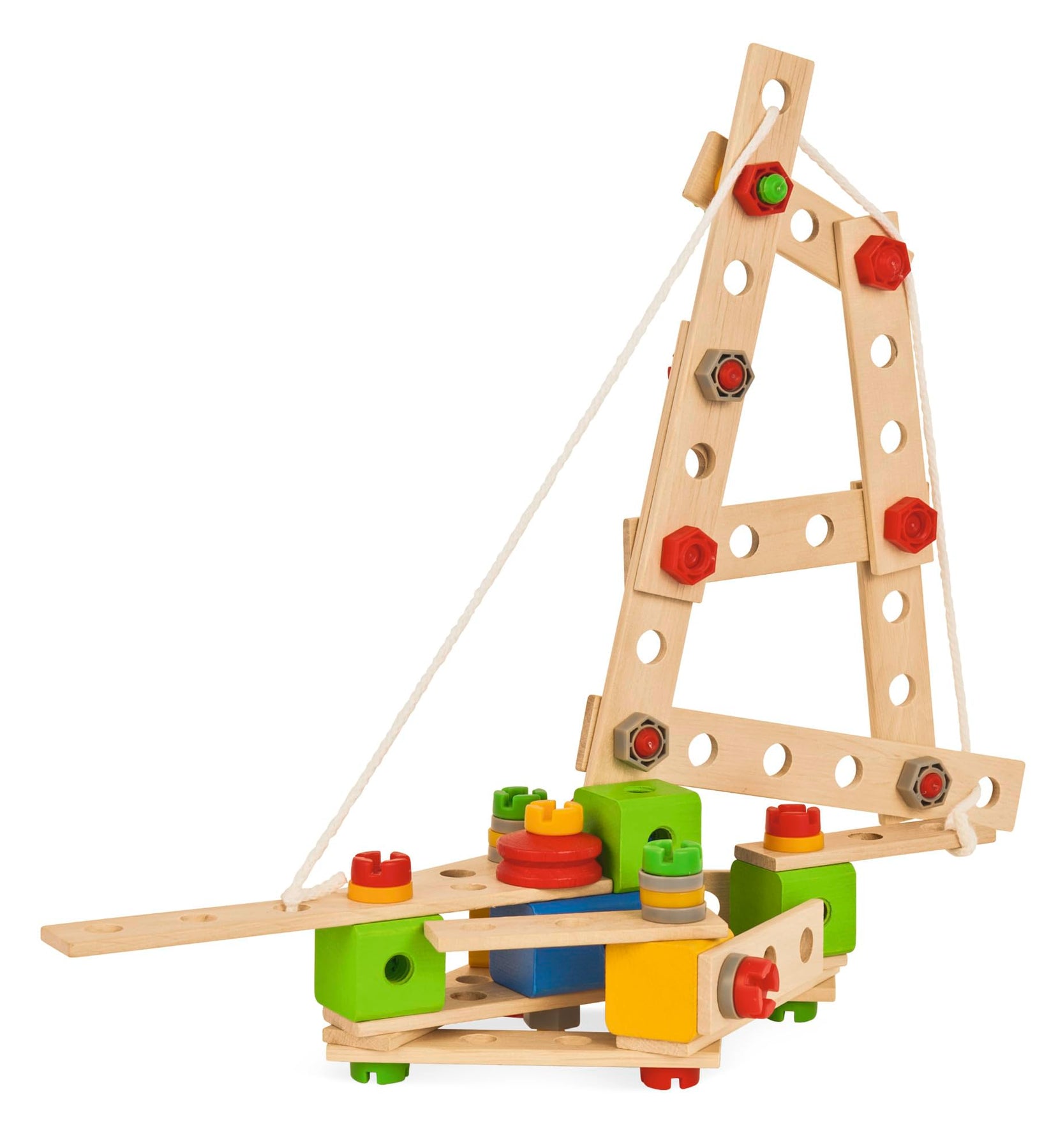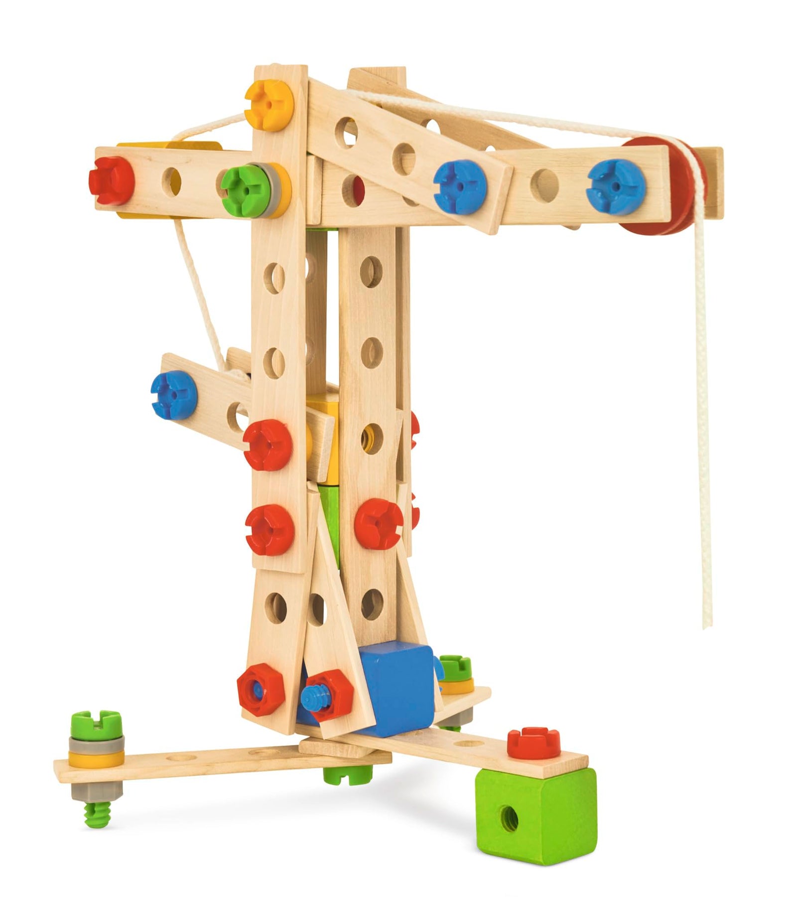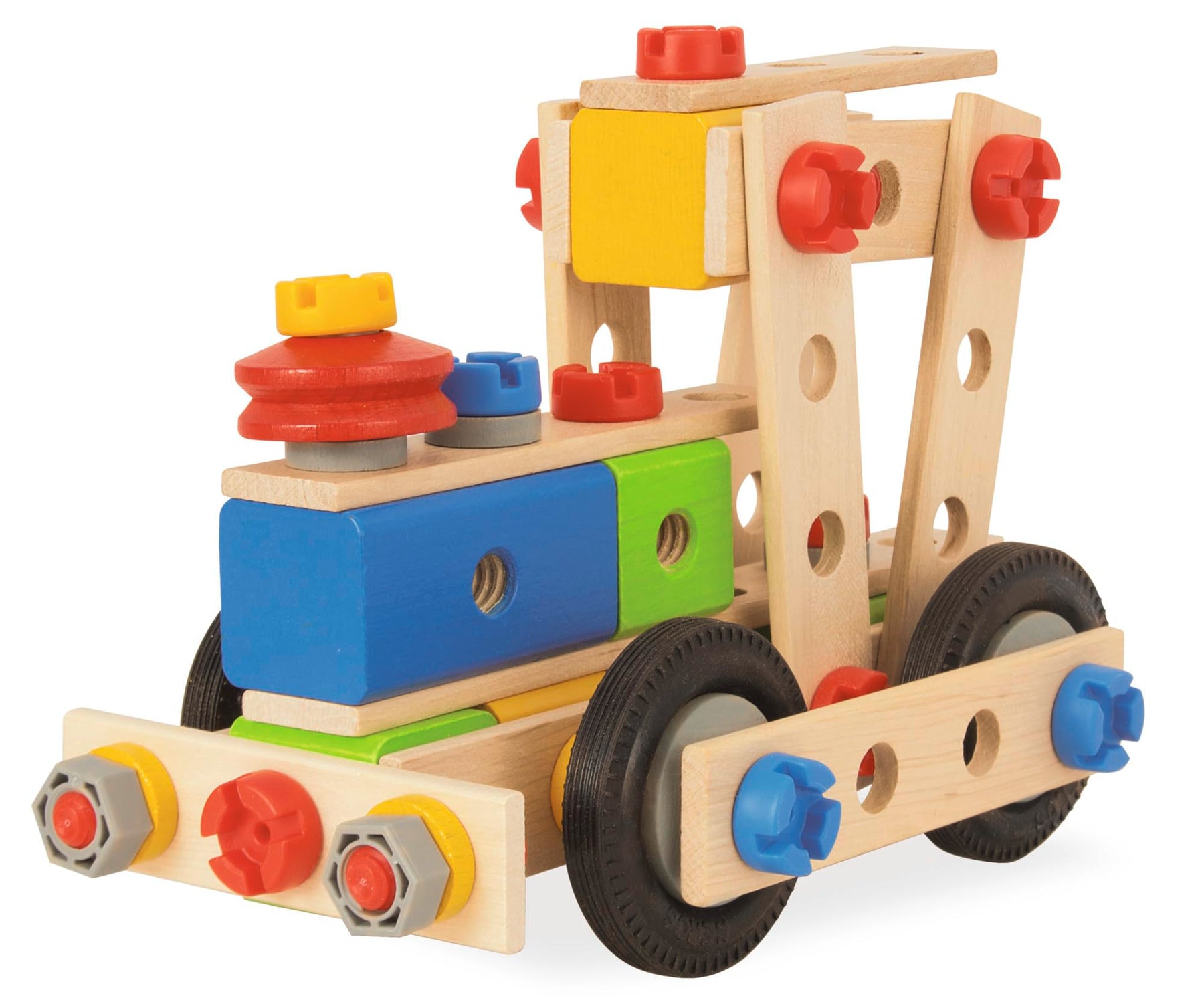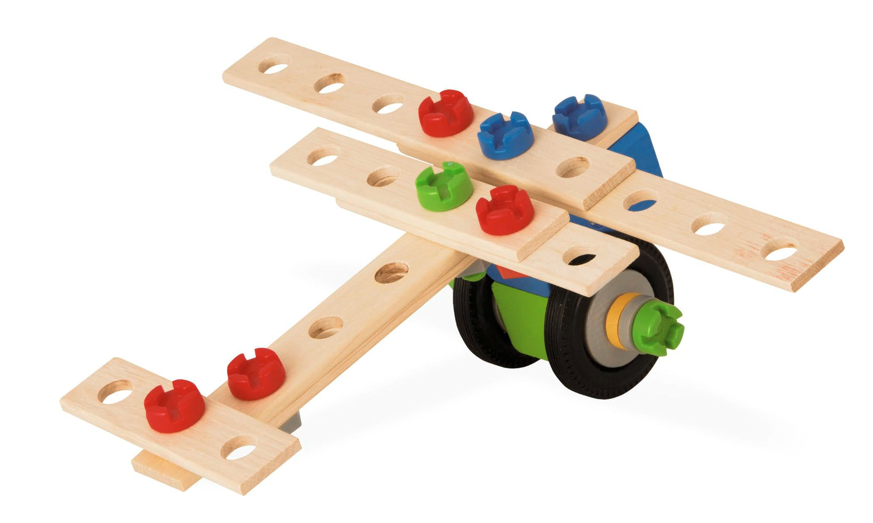 - 90 Teile Set – Mittels der kindgerechten Anleitung können aus den 90 Klötzen, Leisten, Rädern, Schrauben und Muttern mit Geschick neue Fahrzeuge und andere Modelle spielend leicht zusammengebaut werden.