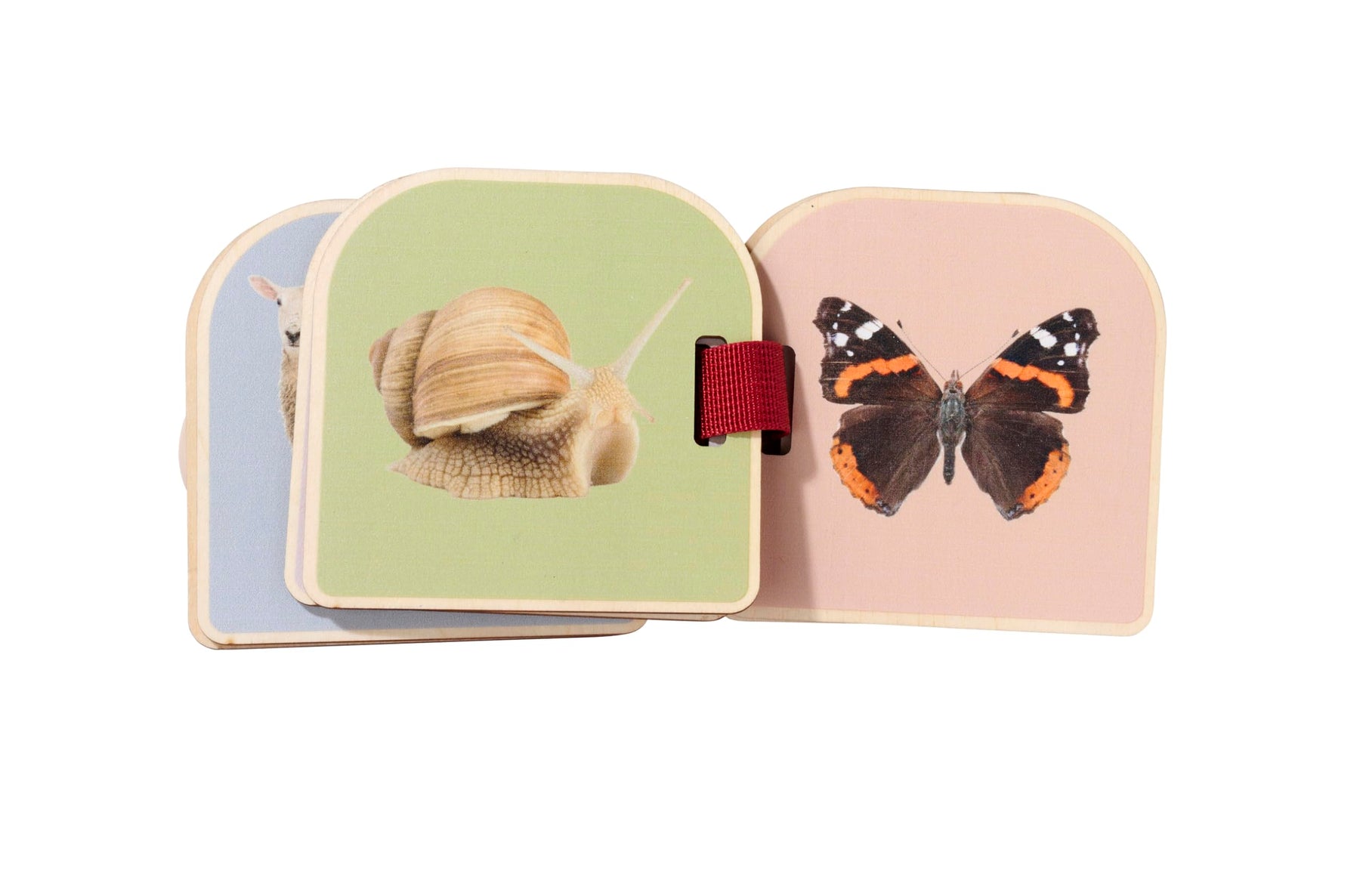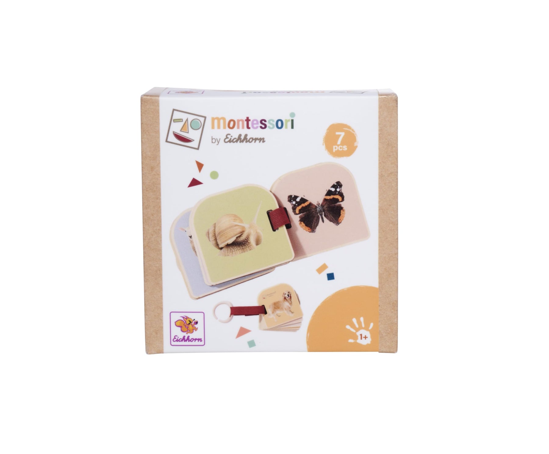 Das schöne Holzbuch ist der erste Begleiter für dein Kind. Es besteht aus 6 Holzplatten, welche vorne und hinten mit niedlichen Tierbildern bedruckt sind. Das Buch kann mit dem Anhängerring an Kinderwagen oder Babyschale befestigt werden. Oder vor das Kind zum Anschauen einzeln hingelegt werden. Die Größe und die abgerundeten Ecken sind perfekt für kleine Kinderhände. Das Montessori Bilderbuch besteht aus 100% FSC zertifiziertem Lindenholz und ist für Kinder ab 1 Jahr geeignet. Lernziele: Allgemeinbildung – Tiere kennenlernen Sprache & Wortschatz Abstraktes Denken