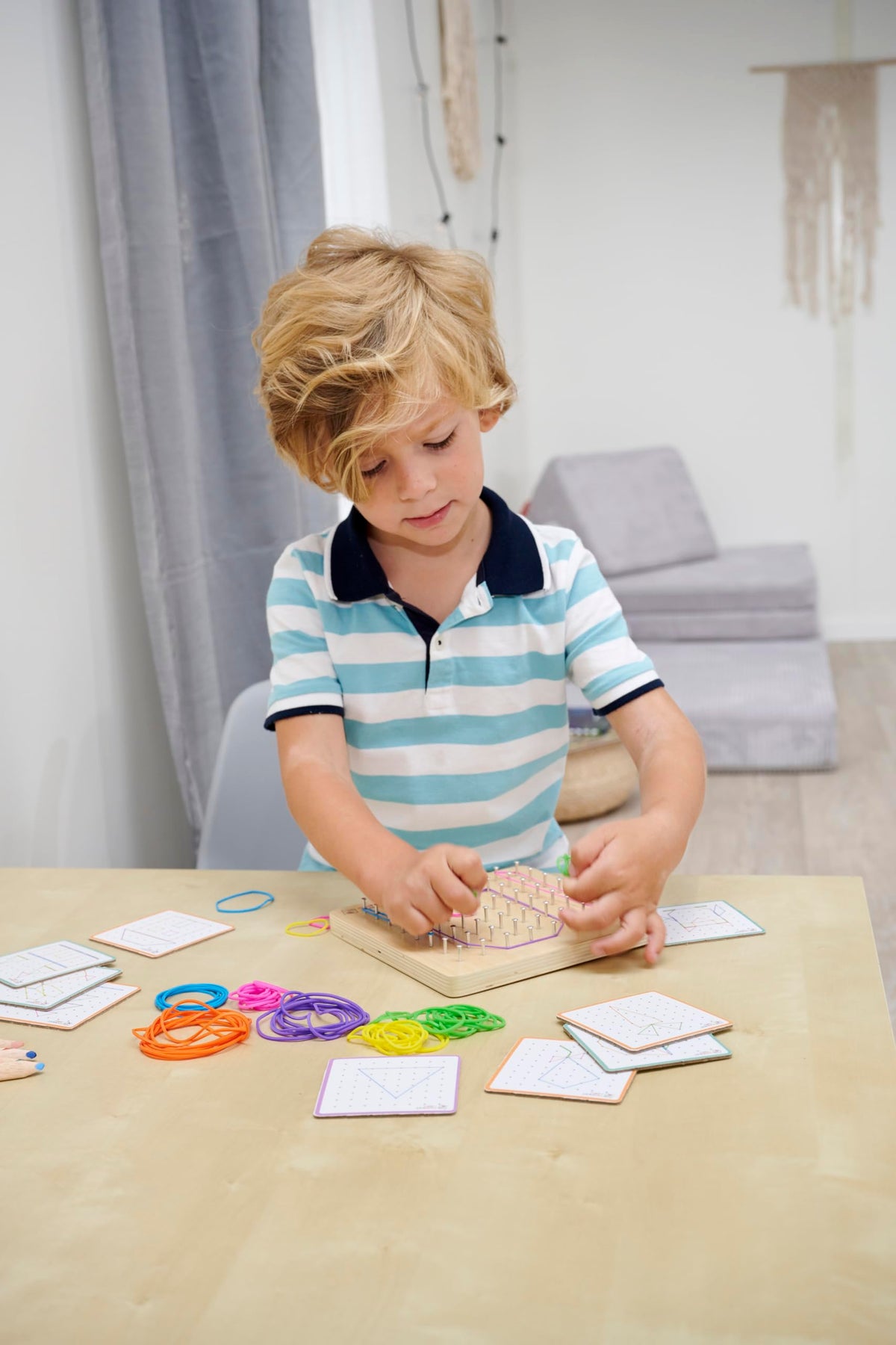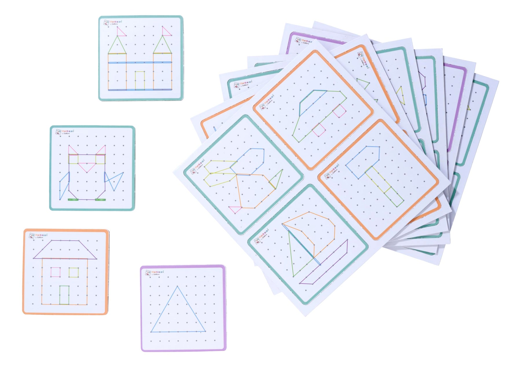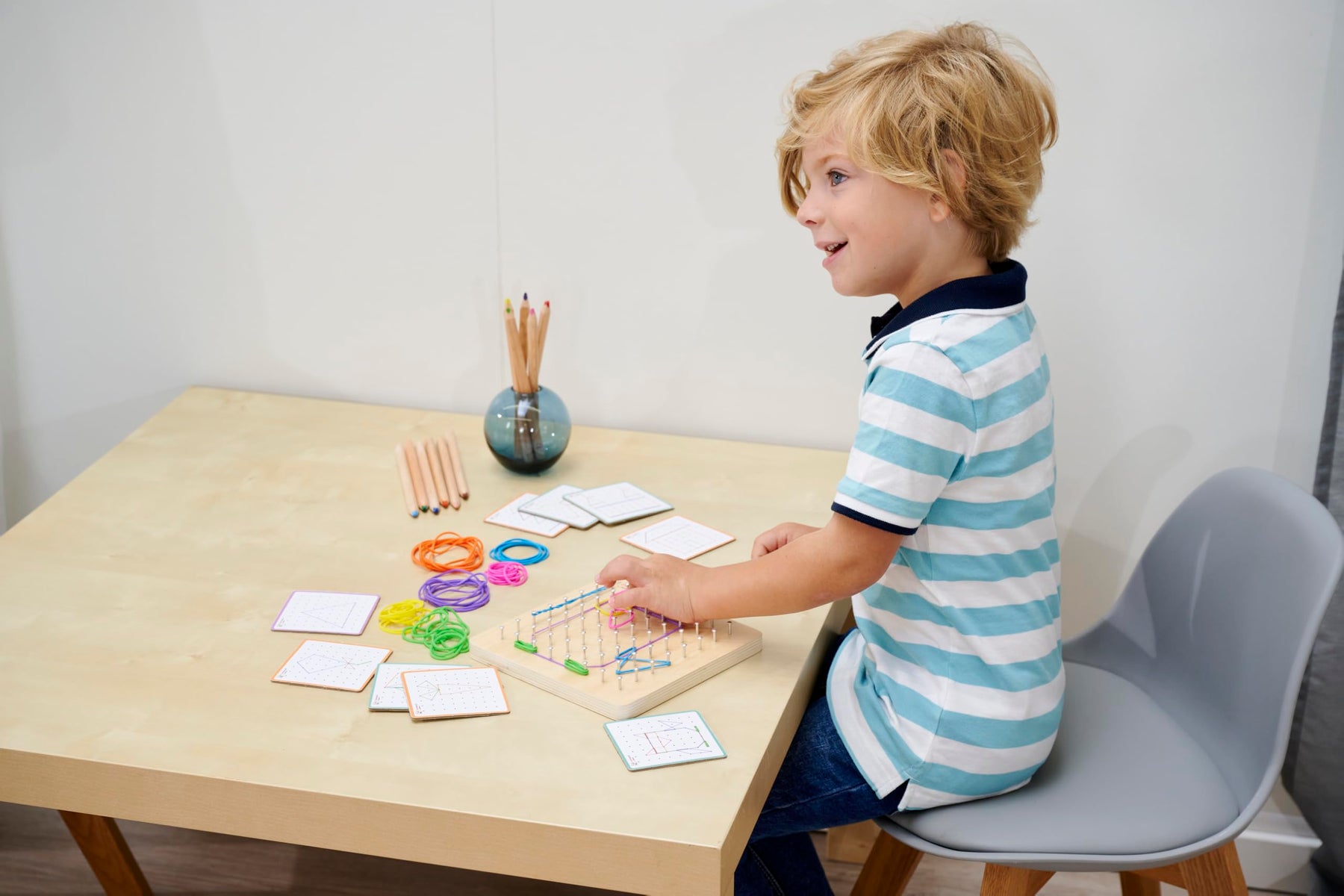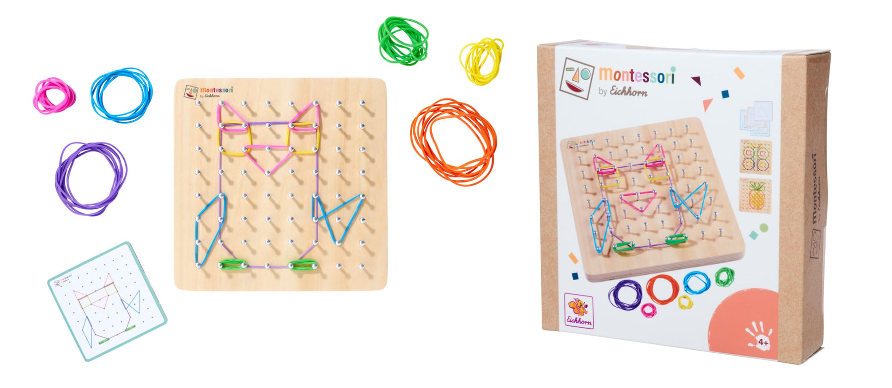 Das Montessori Geometrie Board mit 64 Nägeln und 30 farbigen Gummis ist ein tolles Set zur Förderung der Feinmotorik und Kreativität. Dein Kind kann sich nach Belieben eine Figur ausdenken oder anhand der 48 Aufgabenkarten mit verschiedenen Schwierigkeitslevel ein Motiv nachbauen. Das Geometriebrett ist praktisch und kann überall mitgenommen werden – ob im Auto, ins Restaurant oder zu einem Freund - ein idealer Reisebegleiter. Das 18x18cm große Montessori Geobrett besteht aus 100% FSC zertifiziertem Lindensperrholz und ist für Kinder ab 4 Jahren geeignet. Lernziele: Kreativität Auge-Hand-Koordination Feinmotorik Raum- und Lagewahrnehmung Räumliches Denken
