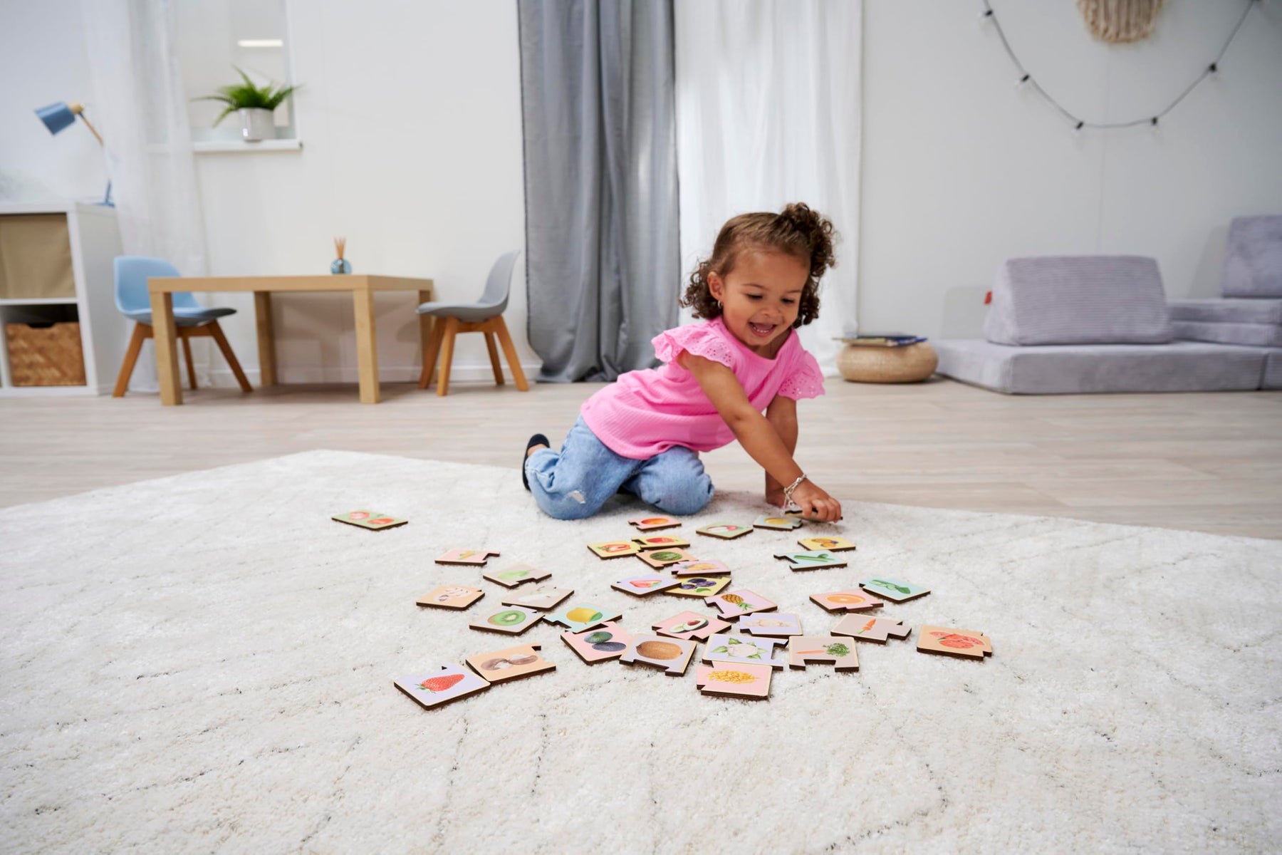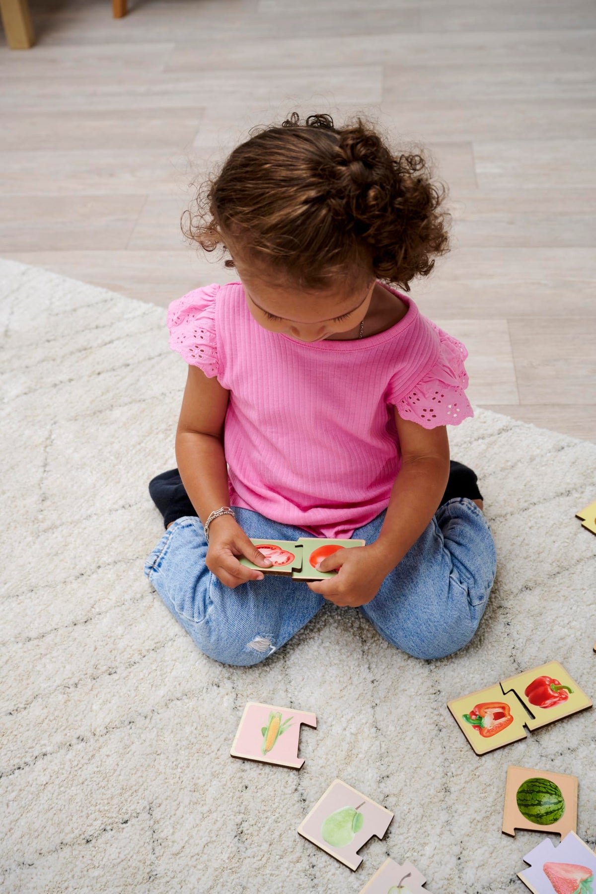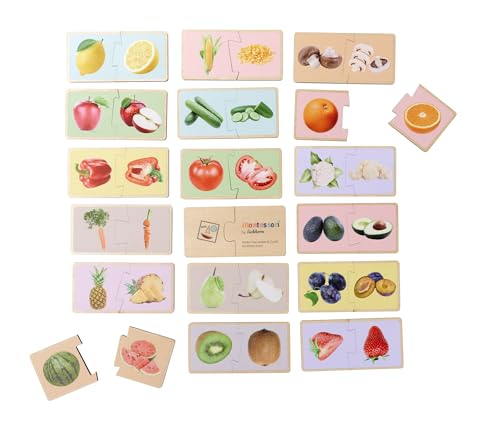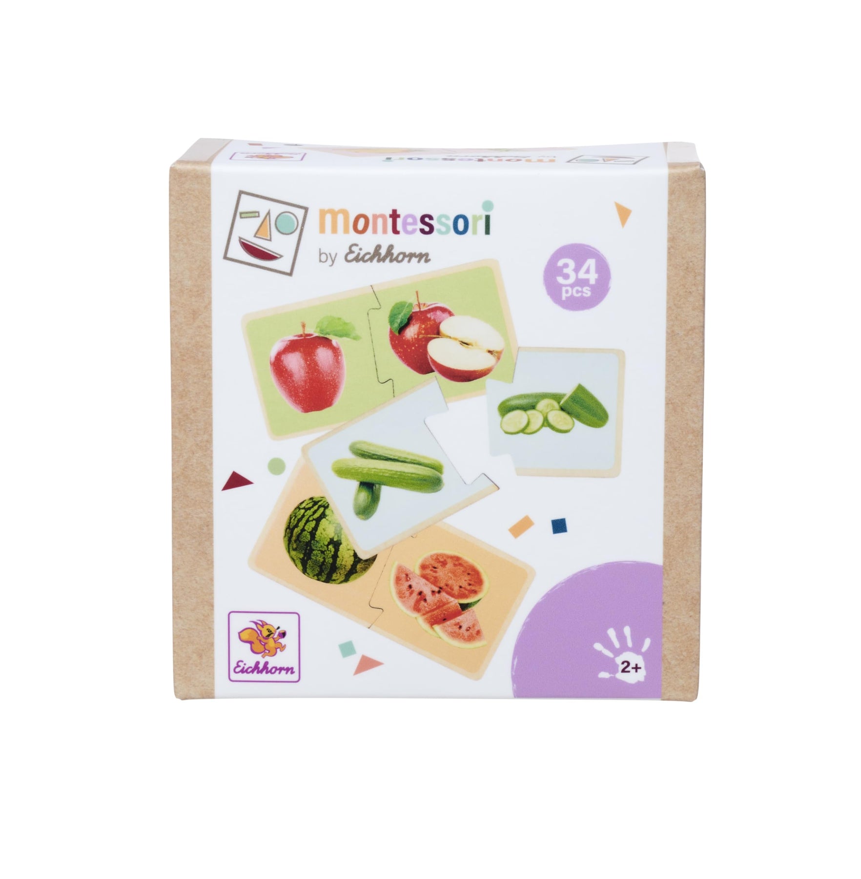 Mit diesem attraktiven Holzpuzzle aus der Montessori Linie lernt dein Kind unterschiedliche Obst- und Gemüsesorten kennen. Die passenden Puzzlepaare müssen zusammengepuzzelt werden und dann richtig benannt werden. Die 34 Puzzleteile sind mit realitätsechten Abbildungen bedruckt und sorgen für eine starke Wiedererkennung aus dem Alltag. Das Montessori Holzpuzzle besteht aus 100% FSC zertifiziertem hochwertigem Lindenholz und ist für Kinder ab 2 Jahren geeignet. Lernziele: Merkfähigkeit Konzentration Orientierungssinn Farben lernen