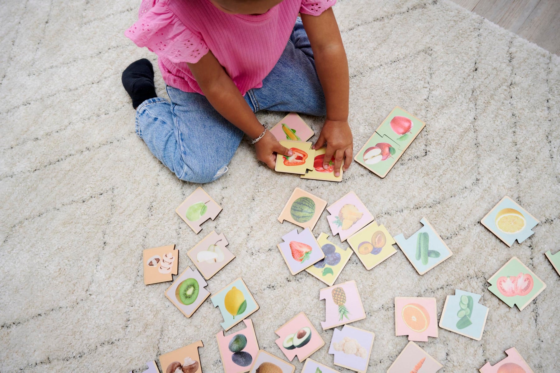 Zusammenpuzzeln der passenden Puzzlepaare und richtiges Benennen der Obst- und Gemüsesorten.