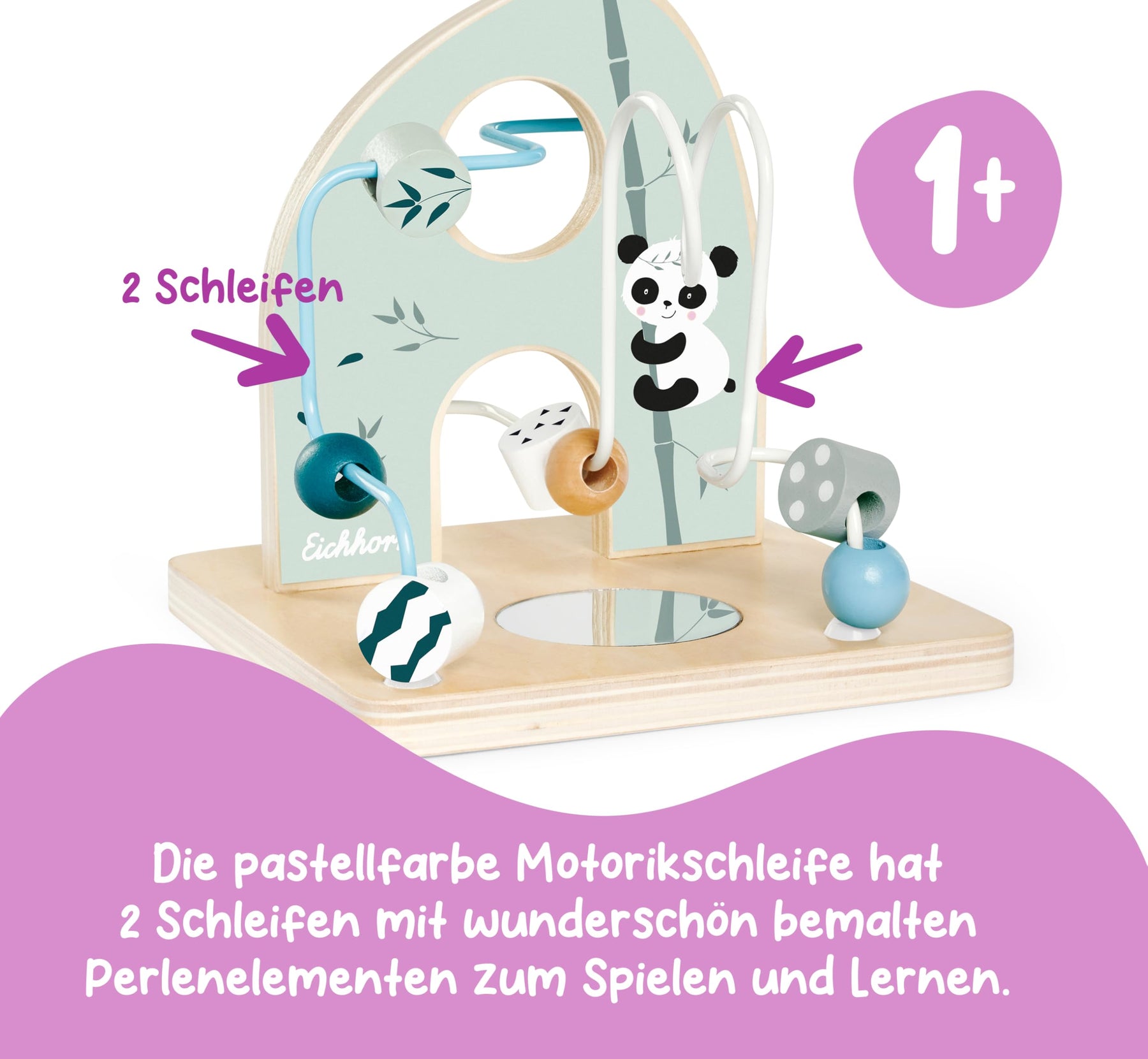 - Spielerisches Lernen – Die Motorikschleife bietet zwei bunte Schleifen und eine Spiegelfläche, die Kinder dabei unterstützt, Formen und Farben spielerisch zu entdecken.