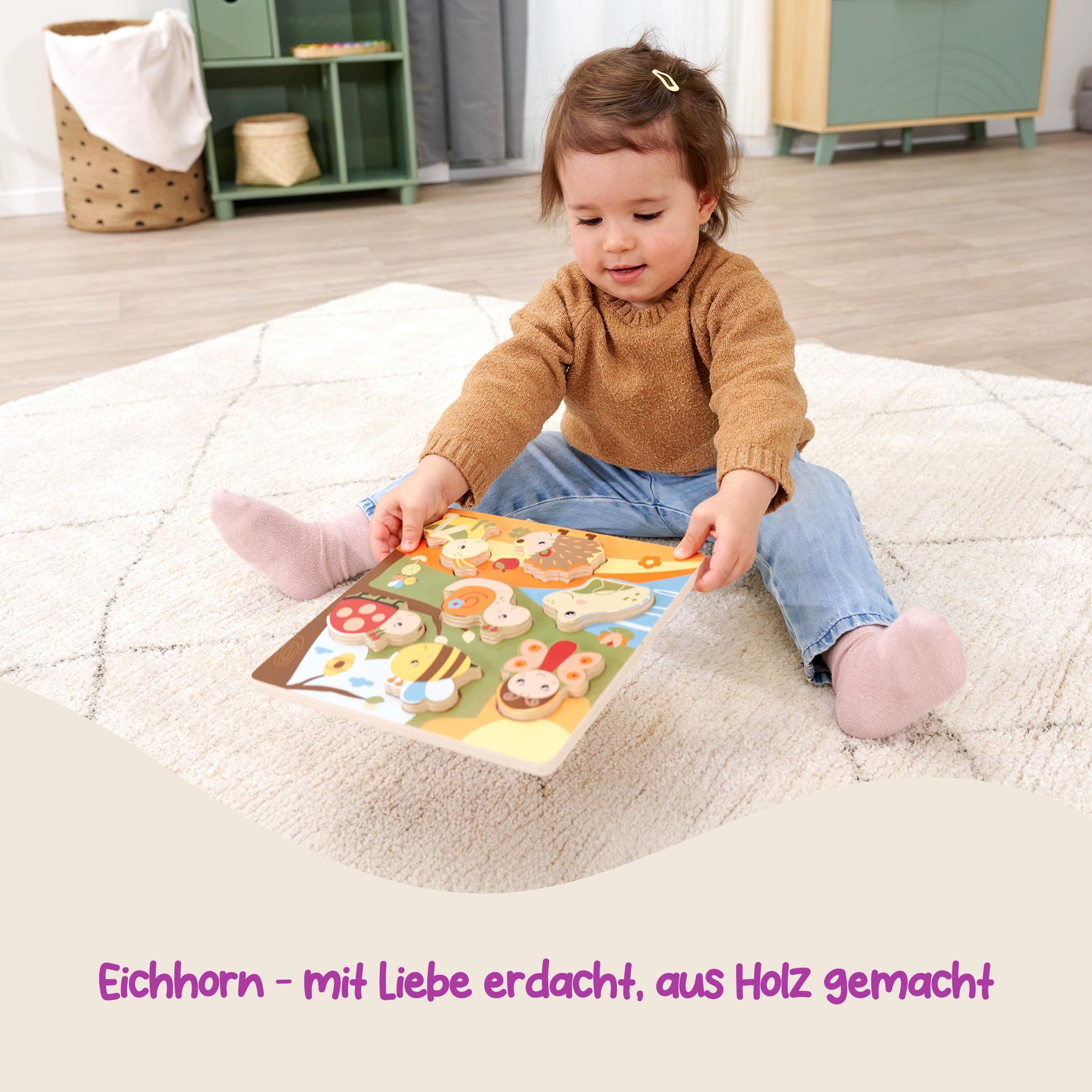 Entdecke das Eichhorn Fühlpuzzle aus der Bee Happy Linie– ein ganz besonderes Puzzle, das die Sinne deines Kindes auf magische Weise anspricht. Dieses liebevoll gestaltete Puzzle ist perfekt für kleine Entdecker ab 1 Jahr und vereint hochwertige Materialien mit pädagogischem Mehrwert. Gefertigt aus 100% FSC-zertifiziertem Holz, sorgt das Puzzle für nachhaltigen Spielspaß. Jedes der niedlichen Tiermotive – von der fröhlichen Biene bis hin zum bunten Schmetterling – besticht durch sanfte Farben und eine matte Haptik. Doch der wahre Zauber steckt unter den Puzzleteilen: Hier erwartet Ihr Kind ein faszinierendes sensorisches Erlebnis. Unterschiedliche Stoffe wie Cord, Glitzerstoff und Filz laden zum Ertasten ein und fördern so spielerisch die Feinmotorik und den Tastsinn. Das Eichhorn Bee Happy Fühlpuzzle – ein hochwertiges und liebevoll gestaltetes Spielzeug, das für leuchtende Kinderaugen sorgt und in jedem Kinderzimmer ein Highlight ist.