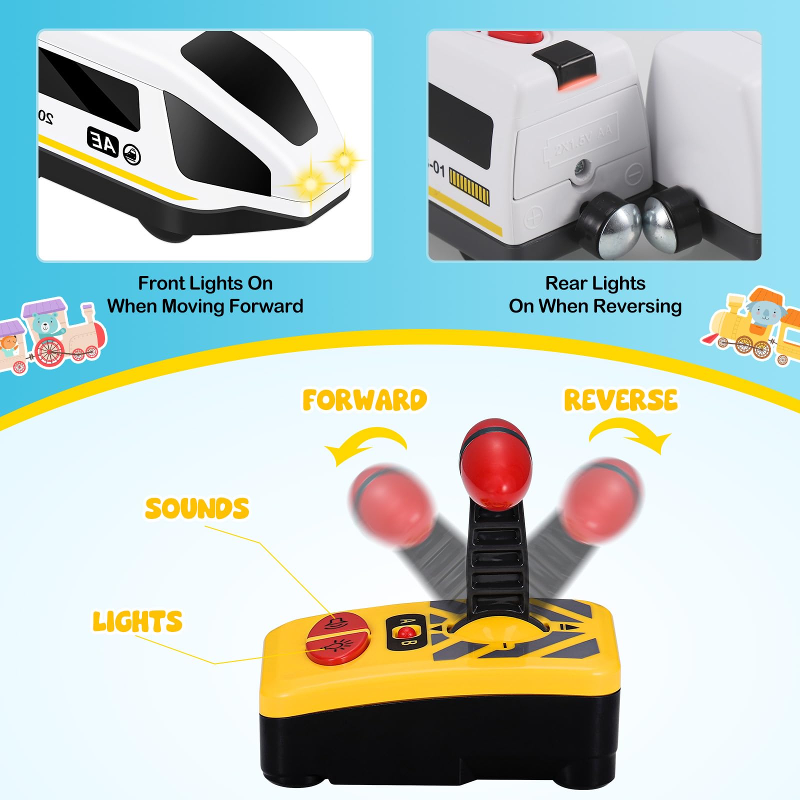 - 【Licht und Sound】 Diese Holzeisenbahn elektrisch bietet realistische Geräusche und blinkende Lichter, die den Zugfahrtsound und das Horn imitieren. Jedes Mal, wenn die Vorwärts- oder Rückwärts-Taste gedrückt wird, ertönt das Dröhnen des Zuges und die entsprechenden Lichter leuchten auf. Die Stopp-Taste erzeugt ein angenehmes Bremsgeräusch, was das interaktive Erlebnis für Kinder verstärkt und sie das Gefühl vermittelt, sich in einem echten Bahnhof zu befinden.