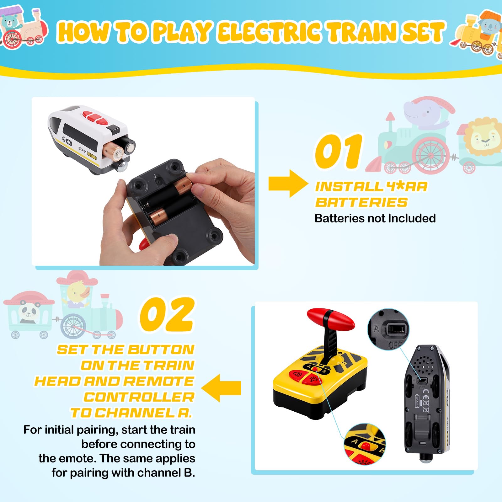 - 【Elektrischer Zug Holzeisenbahn】Dieses Zugset benötigt 4 AA-Batterien, um sowohl die Fernbedienung als auch die Lokomotive zu betreiben (Batterien sind nicht enthalten). Der Zug kann über die Tasten auf der Oberseite oder mit der Fernbedienung vorwärts oder rückwärts fahren. Auch jüngere Kinder können es problemlos bedienen. Hinweis: Stellen Sie sicher, dass bei der ersten Nutzung die Frequenz auf der Fernbedienung und der Lokomotive übereinstimmt (wählen Sie entweder Kanal A oder B).