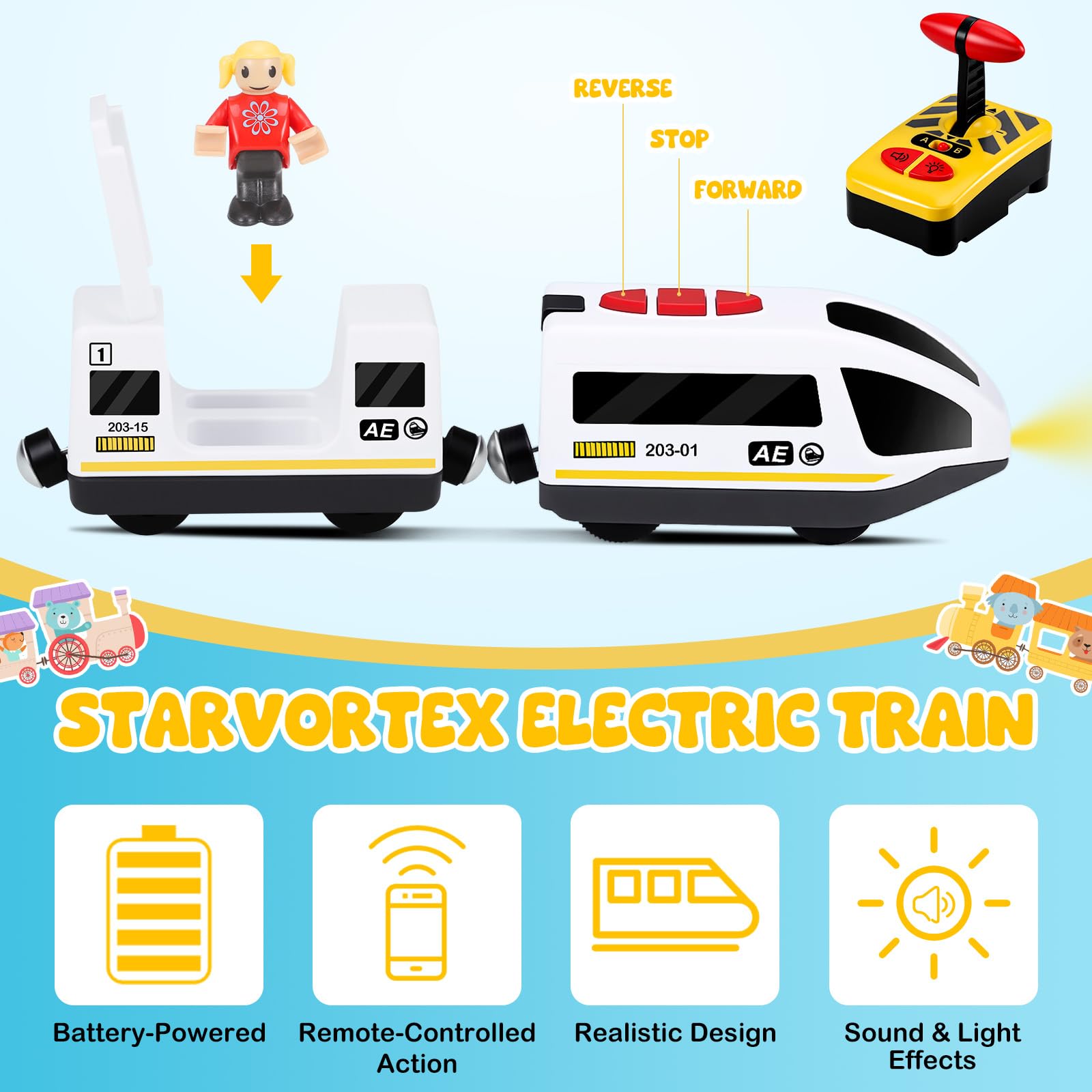 - 【Ideales Lernspielzeug】 Diese elektrische Lokomotive Holzeisenbahn ist das perfekte Spielzeug für kleine Zugfans, mit einem realistischen Design und einer attraktiven Farbgestaltung. Der Zug enthält auch einen Zugführer mit beweglichem Arm und Kopf. Das Spiel mit dieser Lokomotive hilft Kindern, die Funktionsweise von Zügen und Triebwagen zu verstehen, und fördert ihre praktischen Fähigkeiten, kognitiven Fähigkeiten, Farberkennung und Hand-Augen-Koordination. Es ist ein ausgezeichnetes Geschenk für die Kleinen.