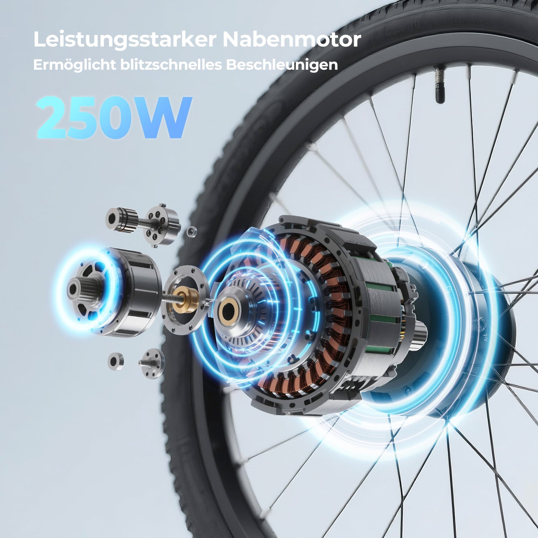 - [Zuverlässiger 250W Heckmotor & 25km/h Geschwindigkeit]Der 36V 250W Nabenmotor sorgt für gleichmäßige Beschleunigung und unterstützt Sie bis zu einer Geschwindigkeit von 25km/h – perfekt für tägliche Fahrten zur Arbeit oder zum Einkaufen.