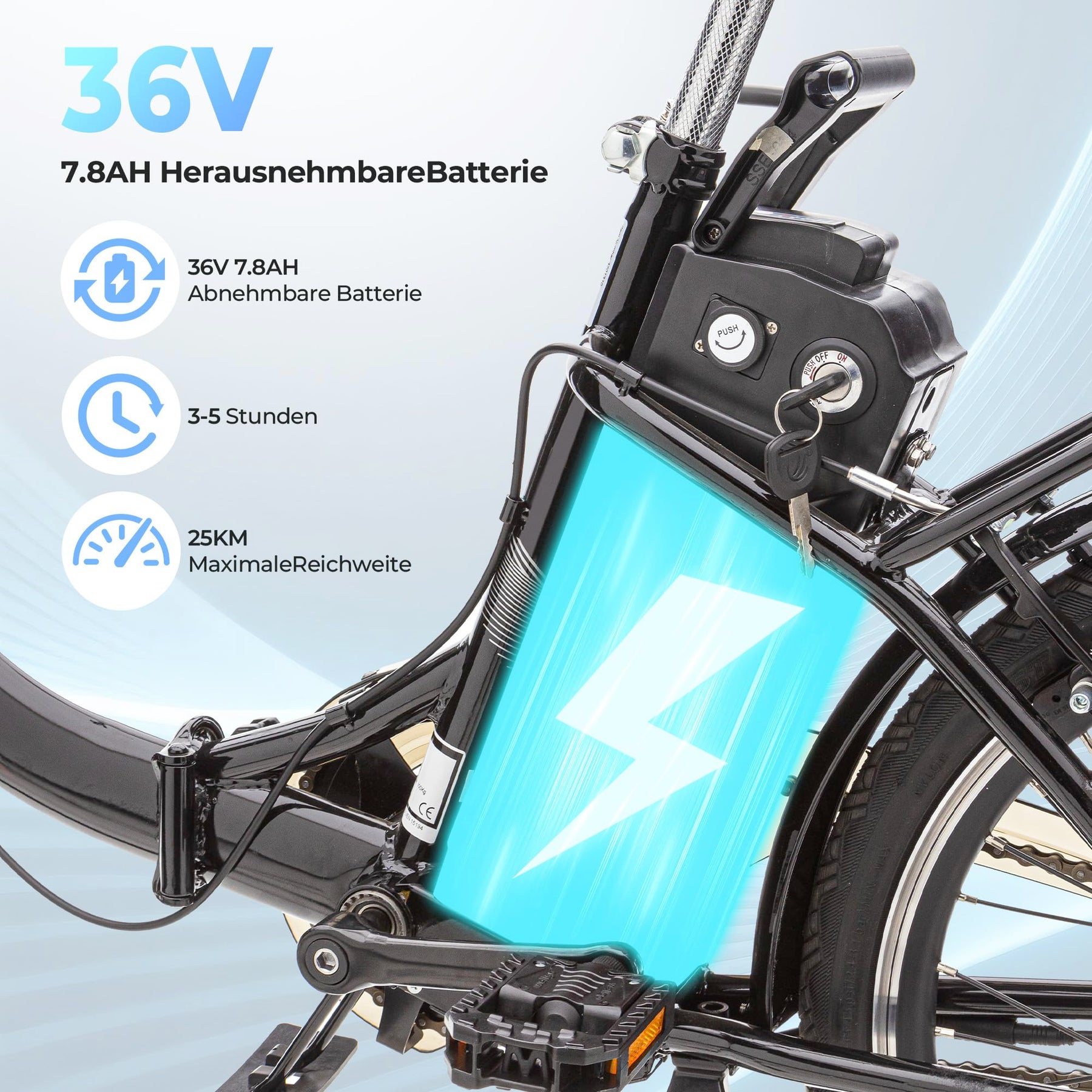 Einzelheiten: Eleglide 20" Faltbares E-Bike für Erwachsene, 250W City Elektrofahrrad mit 36V 7.8Ah Akku, 25km/h, 60–80km Reichweite, LED-Display, V-Bremse, mit Gepäckträger und Licht