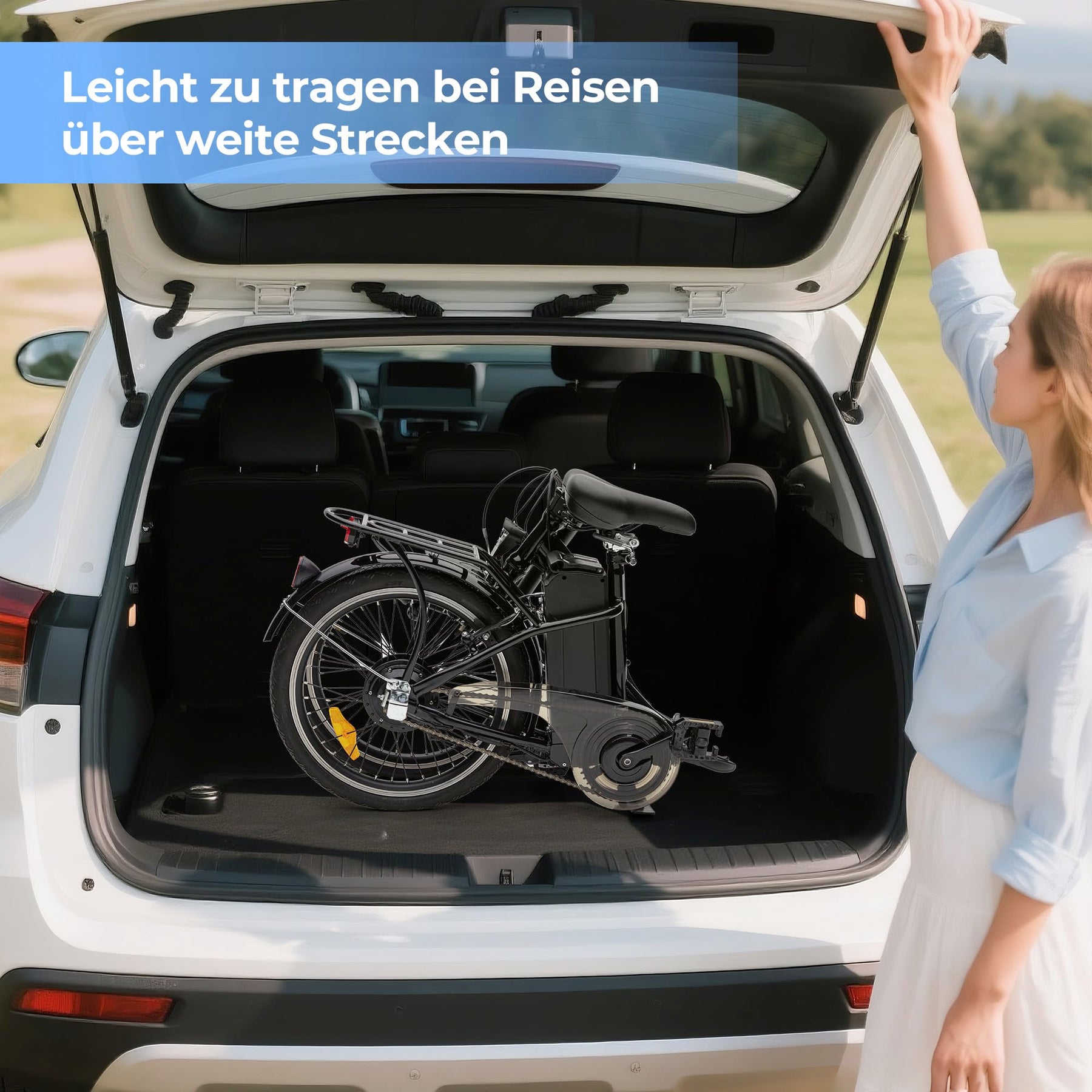 - [Kompaktes & faltbares Design für die Stadt]Mit einem stabilen Stahlrahmen und 20-Zoll-Rädern lässt sich das E-Bike leicht zusammenklappen und platzsparend transportieren – ideal für Pendler in der Stadt oder zur Mitnahme im Kofferraum.