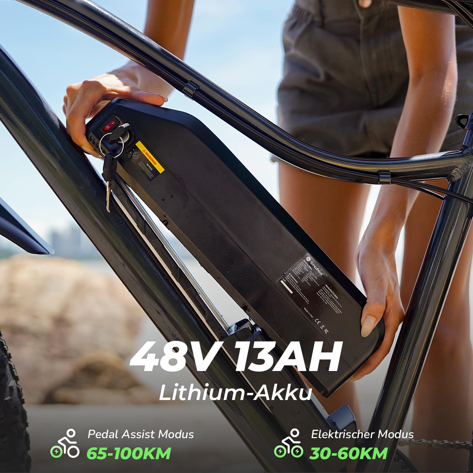 • 【Längerer Bereich】- Stellen Sie sich Wochenendabenteuer ohne Stromsorgen mit unserem E-Bike vor. Die 48V 13Ah herausnehmbare Batterie bietet 35-50km im entspannten Modus und 55-100KM im PAS-Modus. Pendeln, erforschen oder Trails mühelos bewältigen