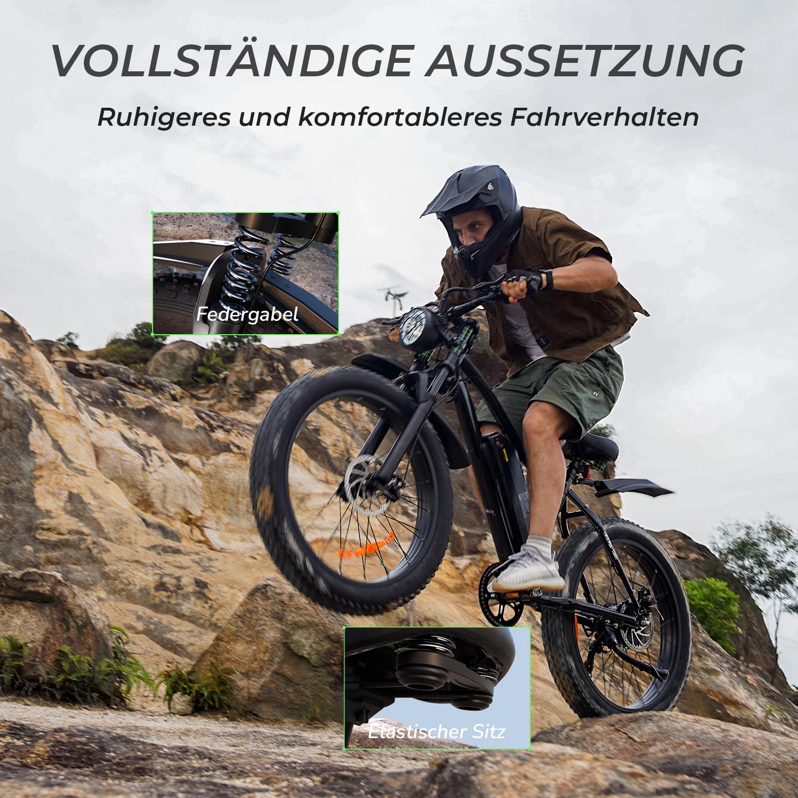 • 【Sanfte Fahrt】- Genießen Sie eine seidenweiche Fahrt mit unserem 26*4.0 Zoll Fat tire Elektrofahrrad. Vorder- und Hinterradfederung absorbieren mühelos Unebenheiten und unwegsames Gelände. Gleiten Sie über Schlaglöcher in der Stadt oder unebene Landstraßen und fühlen Sie den Komfort des weichen, breiten Sattels. Ob im täglichen Pendlerverkehr oder bei Abenteuern am Wochenende, dieses elektrische Mountainbike garantiert eine gedämpfte, angenehme Fahrt.