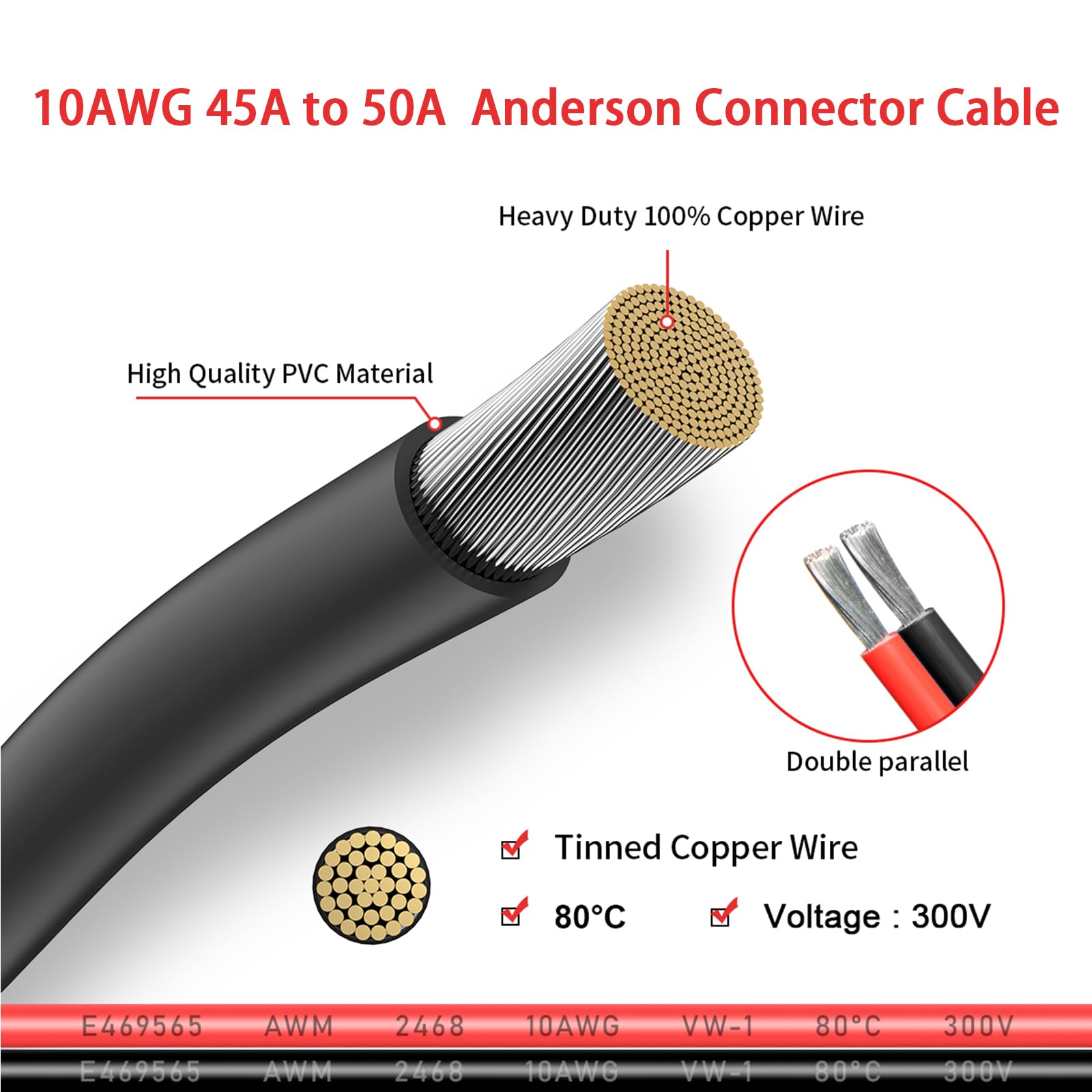 - [Anderson Kabel] Dieses Kabel besteht aus verzinntem 10AWG-Kupferdraht mit UL2468-Zertifizierung und hochwertigem PVC-Nylon-Material. Verzinntes reines Kupfer hat einen geringen Widerstand, ist antioxidativ, korrosionsbeständig und hat eine gute elektrische Leitfähigkeit, sodass Ihr Gerät einen stabilen Strom erhält
