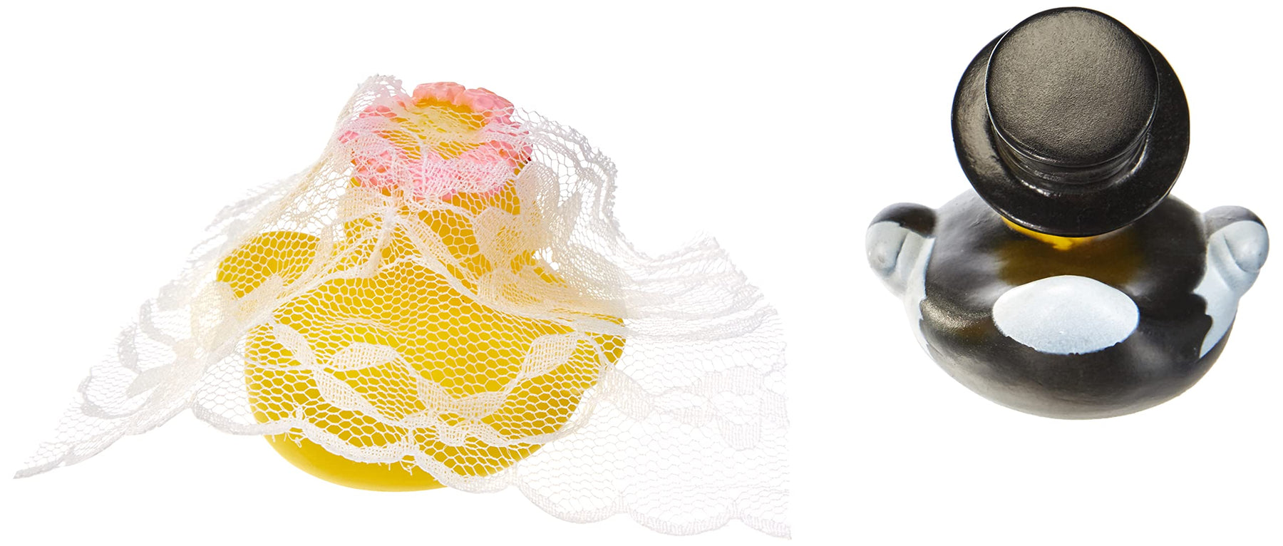 Einzelheiten: Quietschente "Hochzeitspaar" 2er Set mit Braut und Bräutigam gelb Maße je Ente ca. 6 x 6 cm