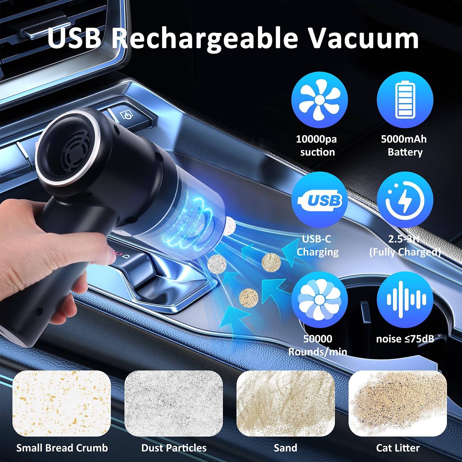 - 。◕‿◕。【USB Wiederaufladbar und Schnurlos】: Unser kleiner handstaubsauger hat eine 5000 mAh Li-on Batterie eingebaut, die mehr Saugleistung erzeugen kann, und ein Adapter von 5 V/2A kann in 3 Stunden schnell vollständig aufladen. Mit dem leistungsstarker handstaubsauger können Sie sich frei bewegen, während Sie Ihre Treppen, Küchen, Auto oder schwer zugängliche Ecken reinigen. Sie können diesen tragbaren handsauger in jedem Speicherplatz einsetzen
