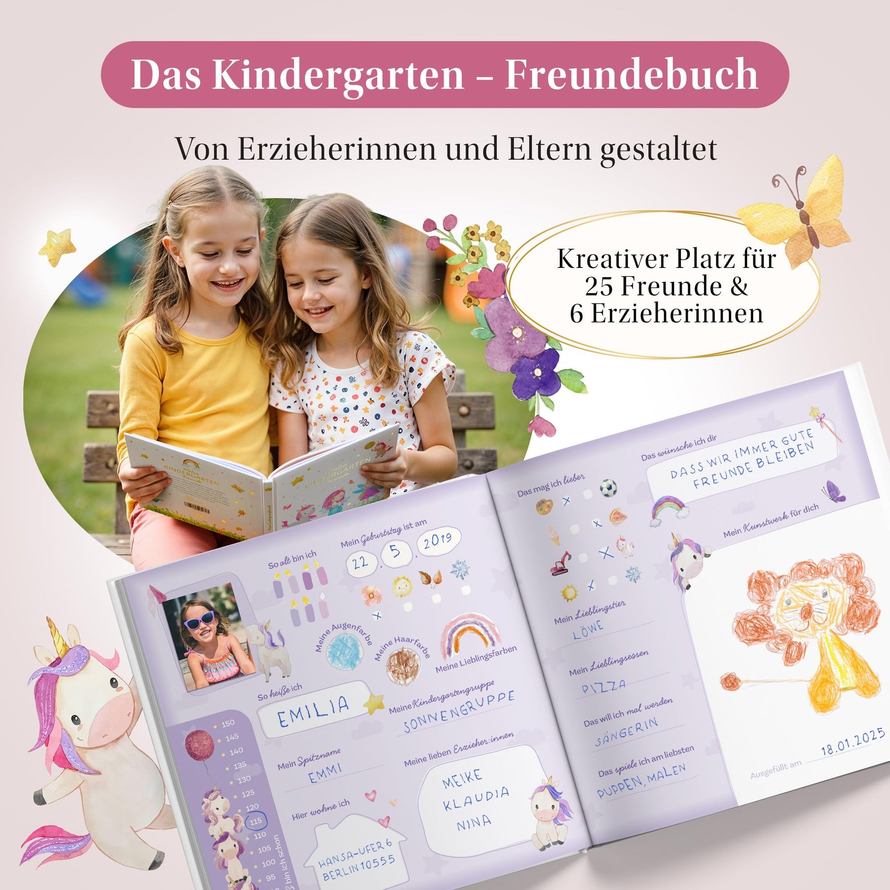 Von erfahrenen Erzieherinnen gestaltet, überzeugen die kindgerechten Freundeseiten durch ihre einfache Struktur, die das Ausfüllen für Kinder leicht und spielerisch macht. Ergänzt wird das Buch durch kreative Zusatzseiten, wie einen Geburtstagskalender, eine Fingerabdruckseite und viel Platz für besondere Feste und Ausflüge.