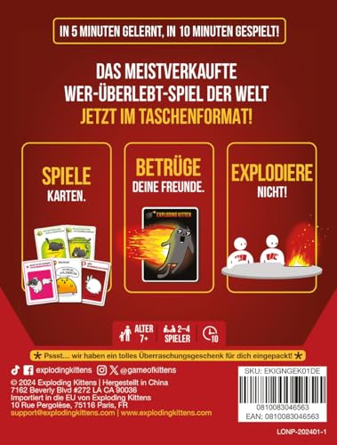 Ob am Strand, bei der nächsten Grillparty, auf einem Schlauchboot oder in der Freizeitparkwarteschlange – Exploding Kittens: Grab & Game passt in jede Handtasche und wird zu eurem idealen Begleiter, damit ihr auch unterwegs nicht auf Russisch Roulette mit Kätzchen statt Patronen verzichten müsst!