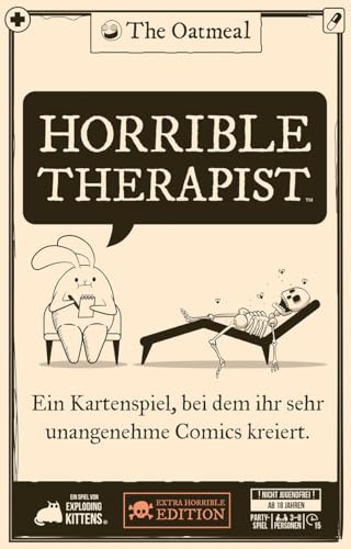Im Partyspiel Horrible Therapist erstellt ihr kurze furchtbare Comics in einer imaginären Therapiesitzung. Wer die lustigste finale Karte spielt, gewinnt.