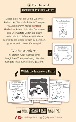 Dieses Spiel hat der Comic-Zeichner The Oatmeal kreiert, der über viele Jahre in Therapie war, bei der ihm häufig intrusive Gedanken kamen. Intrusive Gedanken sind unerwartete Bilder, die einem in den Kopf schießen. Anstatt diese schrecklich makaberen und witzigen Bilder für sich zu behalten, goss er sie in dieses Kartenspiel ...