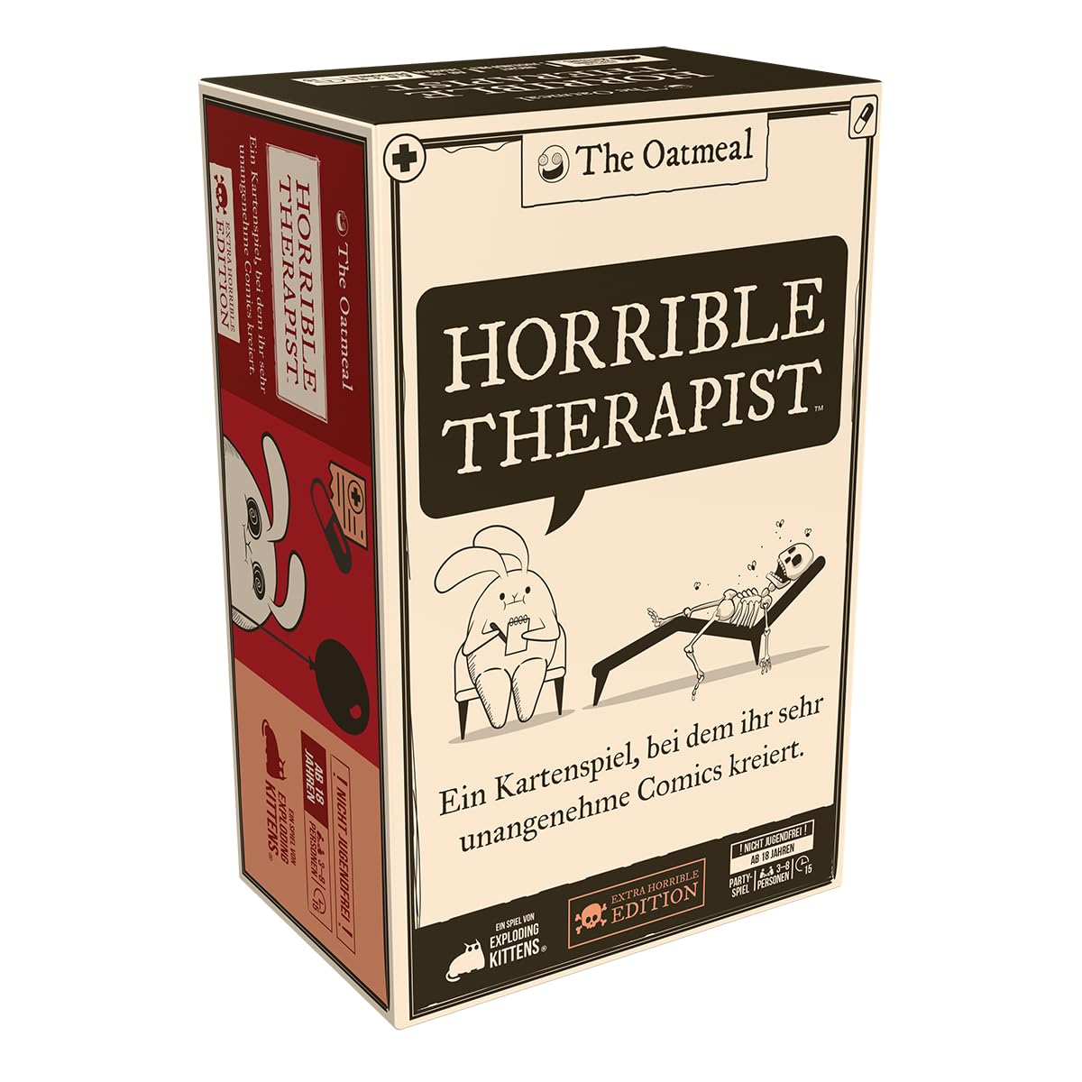 Beim Spielen stellt ihr einen dreiteiligen Comic zusammen. Dieser beginnt mit einer Frage, gefolgt von einer Antwort und schließlich einer Therapie. Ihr erhaltet einen Punkt, falls eure Therapie als bestes Finale des Comics ausgewählt wird. Stellt euch auf die schrägsten, makabersten und anzüglichsten Comics ein, die ihr je gelesen habt.