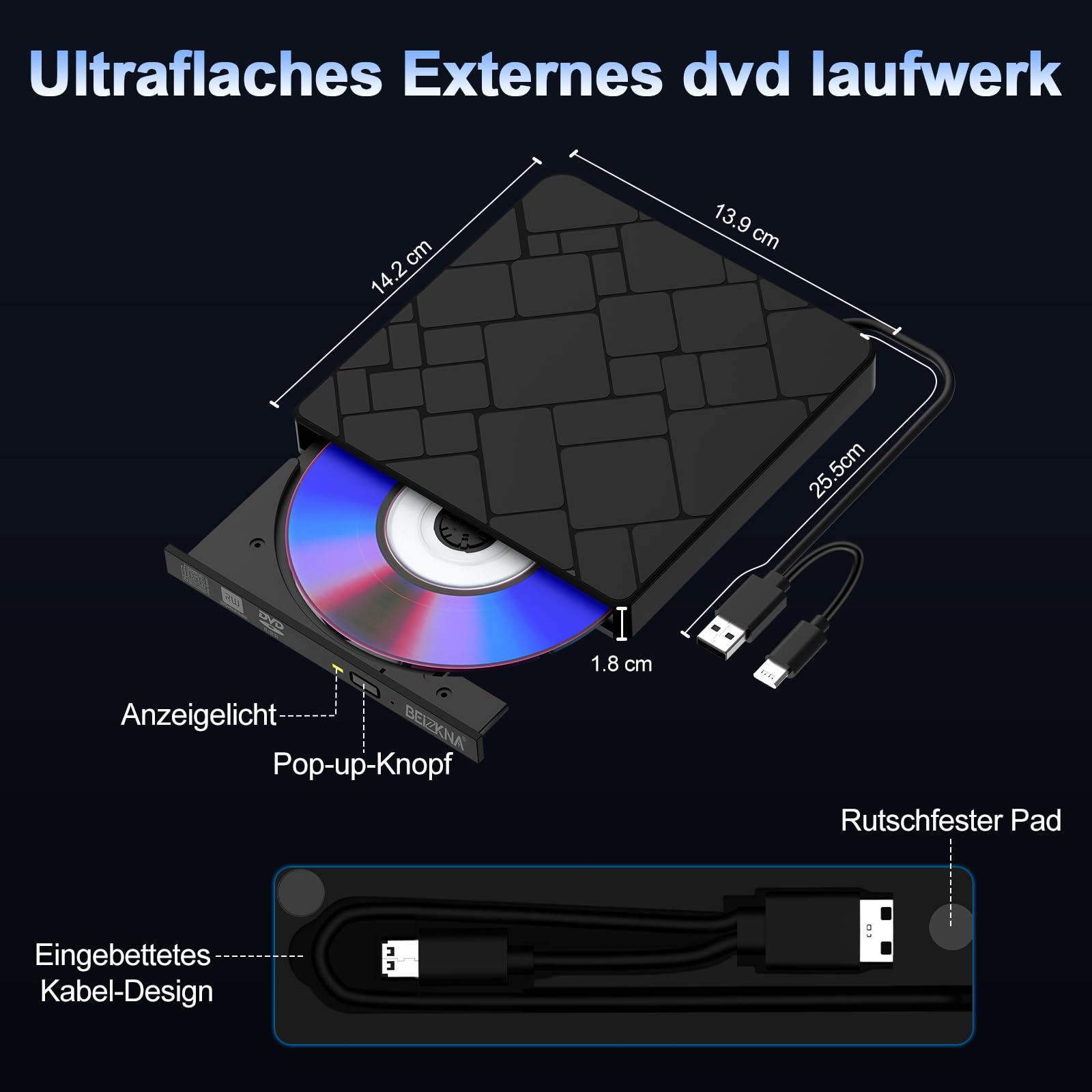 - Schlank und tragbar: Unser leichter CD laufwerk ist perfekt für Ihren Laptop. Das externes dvd laufwerk verfügt über eine Auswurftaste, mit der Sie Discs einfach einlegen und entfernen können. Sie können sich von der Mühe verabschieden, in der Disc stecken zu bleiben. Sie können dieses dvd laufwerk leicht mit sich tragen und einfach in Ihre Tasche stecken und Sie können es überall anschließen.