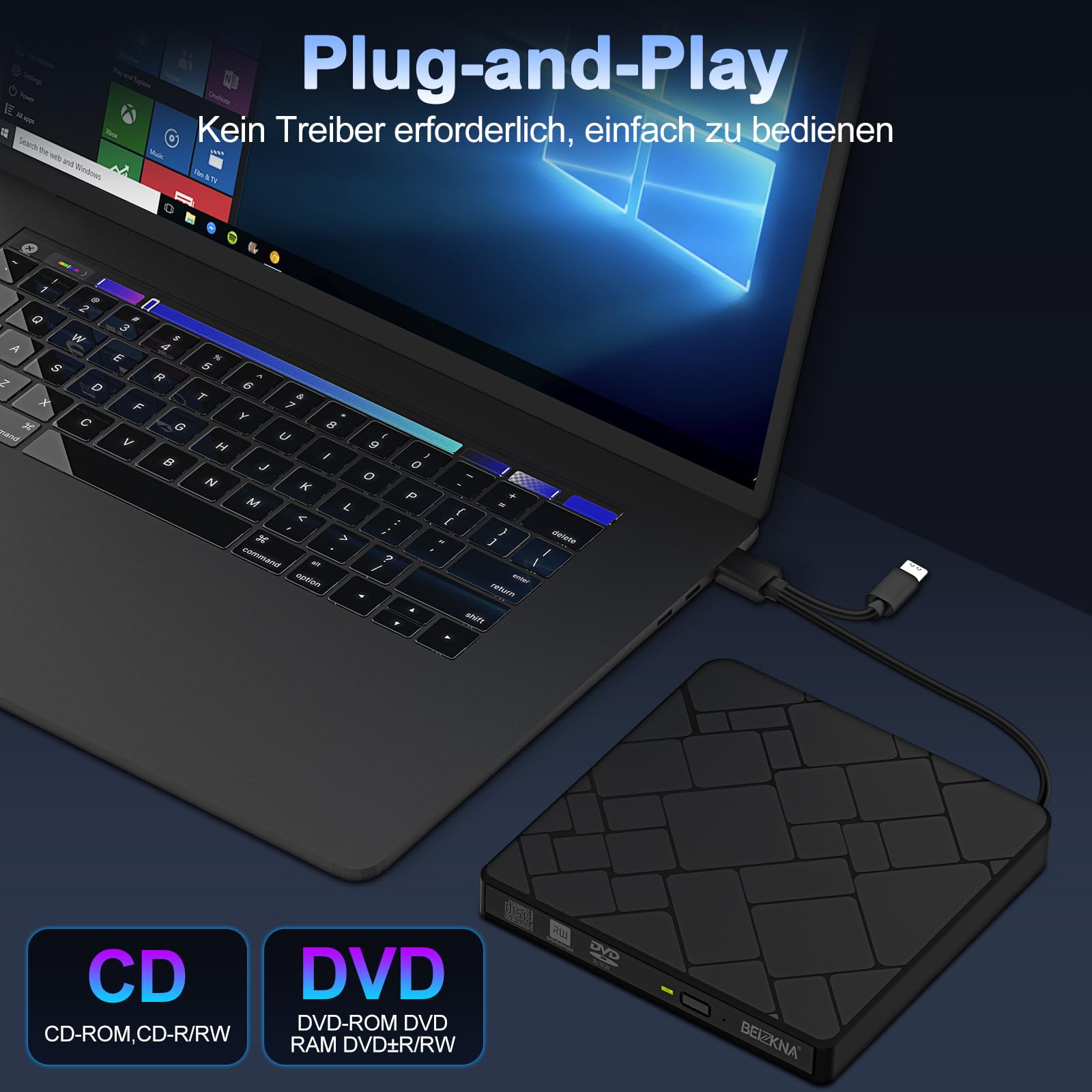 - Plug and Play: Der dvd brenner externr wird über einen USB-Anschluss mit Strom versorgt, kein externer Treiber und Strom benötigt. Schließen Sie es einfach an Ihren Laptop oder Desktop-Computer an und schon können Sie loslegen. Ob Sie Musik hören, Filme ansehen, Software installieren oder Dateien brennen müssen, externes cd laufwerk für laptop praktisch genug, um Ihre Brenn- und Wiedergabeanforderungen zu erfüllen.