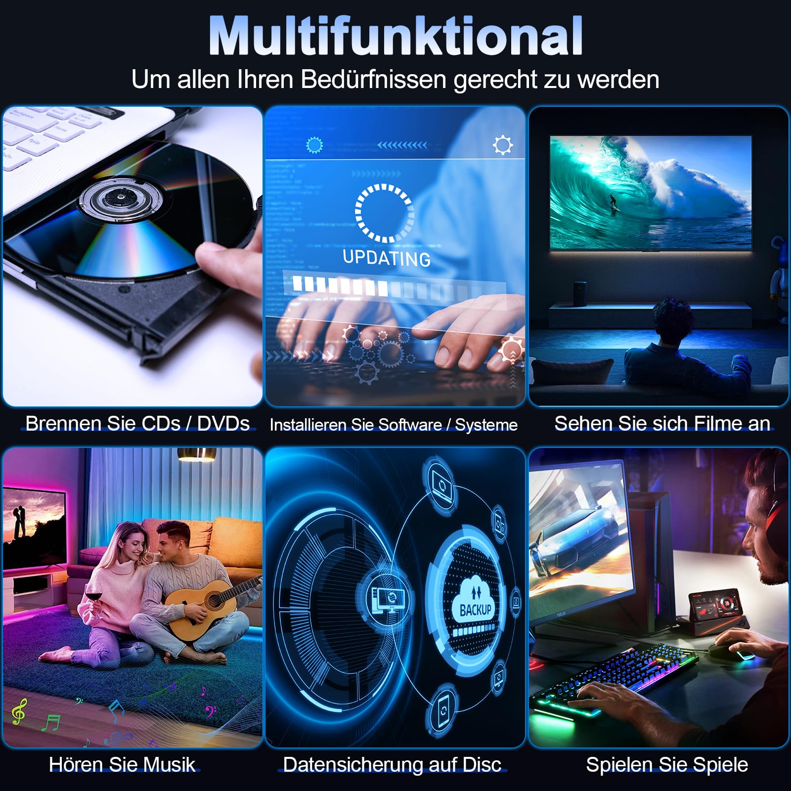 - Breite Kompatibilität: Dieses externes laufwerk unterstützt CD, VCD, SVCD, CD-R/RW, DVD-R/RW und brennen CD+/-RW, DVD+/-RW, etc. extern. Darüber hinaus ist DVD brenner kompatibel mit Windows XP, 7, 8, 10, 11, 2003, Vista, Linux, alle Version Mac OS System, geeignet für Laptop, Notebook, Mac, PC und Desktop. (Hinweis: Inkompatibel mit partiellen Windows 11)