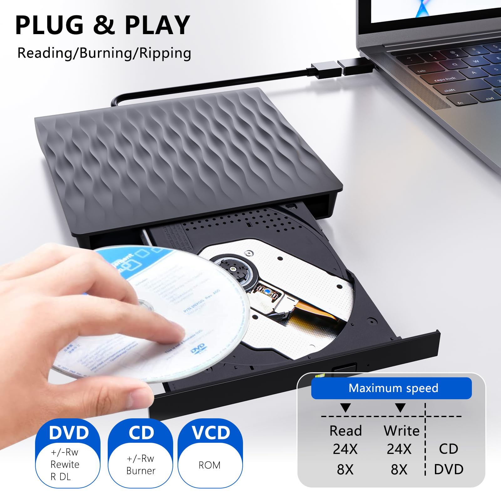 • Super-Kompatibilität - 24x / 8x Lese-/Schreibgeschwindigkeit. DANGZW DVD-RW / CD-ROM-Leser oder -Brenner ist mit einem Laserkopf-Laufwerk ausgestattet, das verschiedene Formate lesen und aufzeichnen kann, wie z. B.: CD, CD-R, CD-RW, DVD-RW, DVD±R, DVD±R DL, DVD±RW, DVD-RAM und DVD. Die Fehlerkorrektur ist sehr leistungsstark, leise und geräuscharm, verbraucht wenig Strom und ist stoßfest.