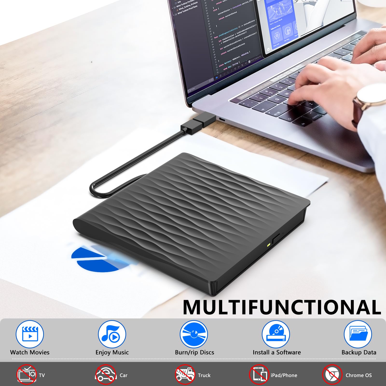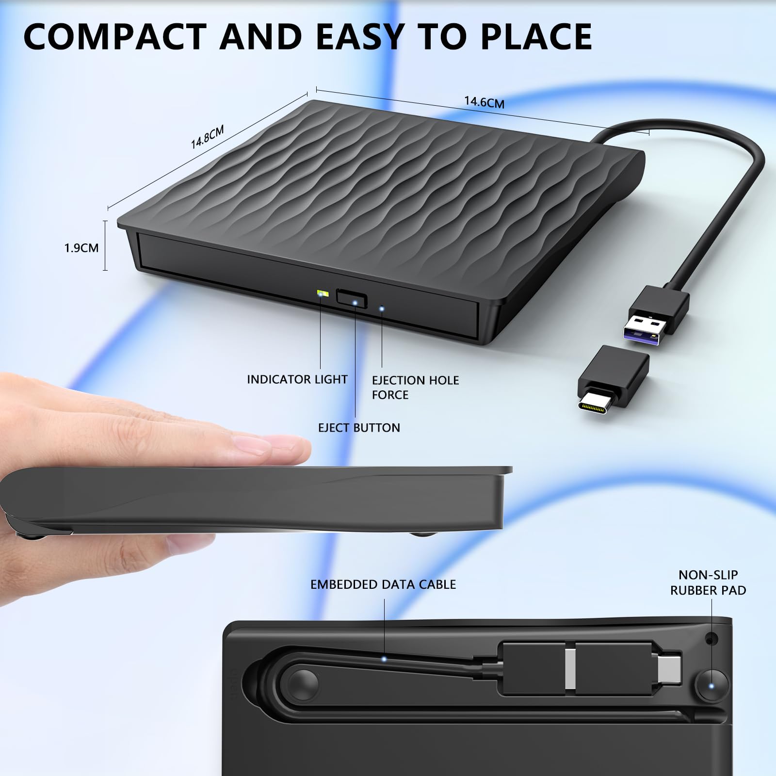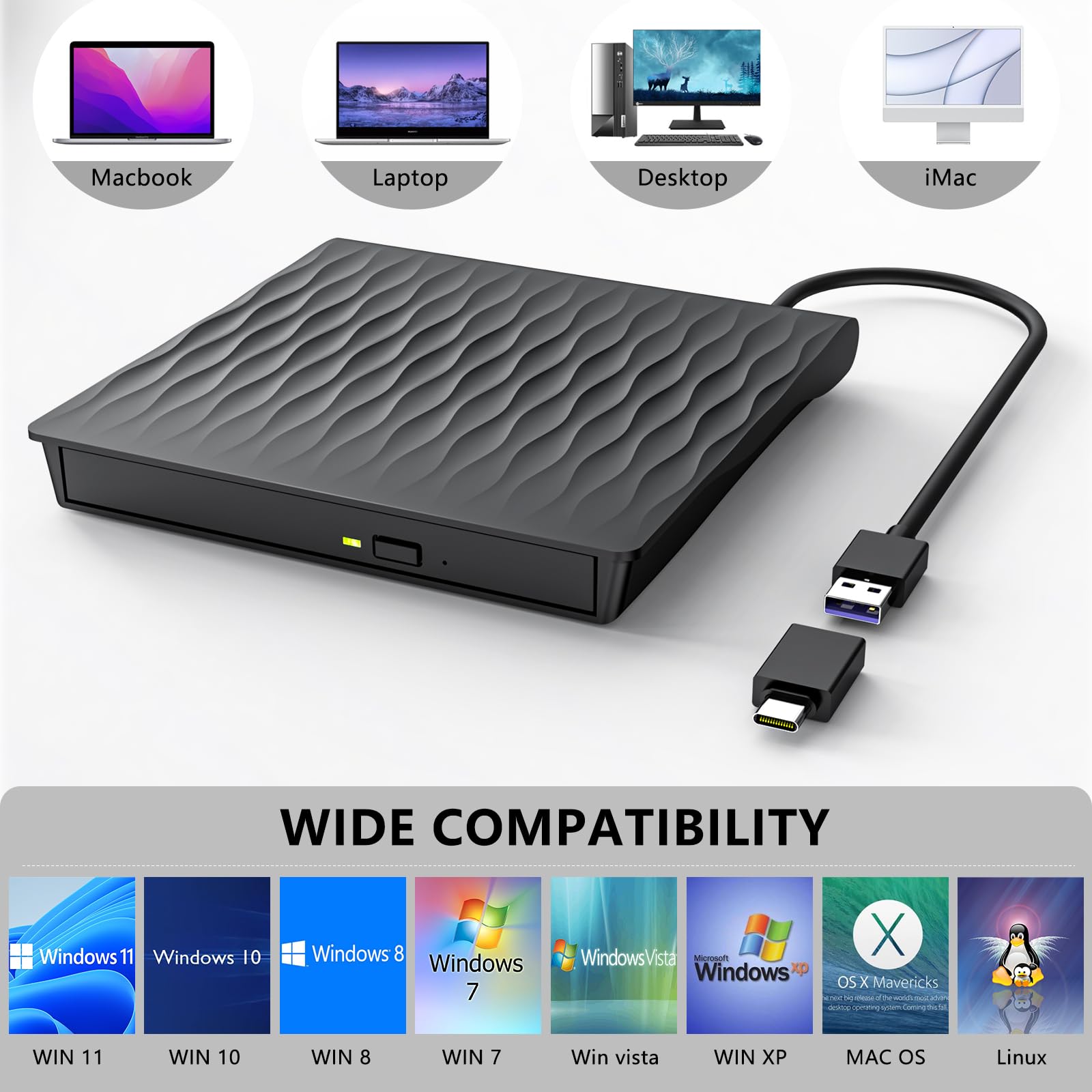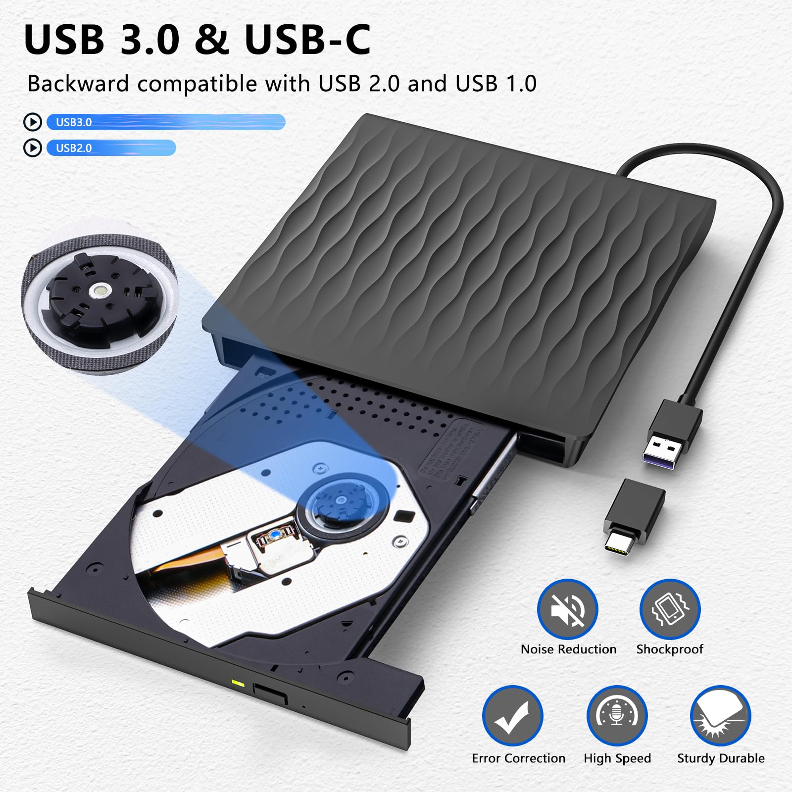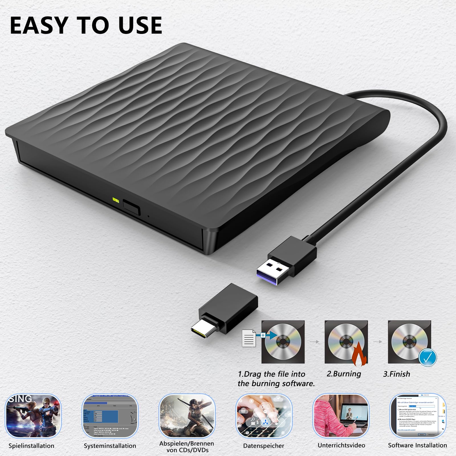 • Externes Laufwerk USB 3.0 – Dieses externes cd laufwerk verwendet eine USB 3.0-Schnittstelle, um Ihnen schnellere Datenübertragungsgeschwindigkeiten (bis zu 5 Gbit/s) und eine stabilere Leistung zu bieten. Es ist auch kompatibel mit USB 2.0/1.0. Zudem ist das integrierte Kabeldesign sauber und leicht, einfach zu transportieren; das texturierte Gehäuse sorgt für ein angenehmes taktiles und visuelles Vergnügen.