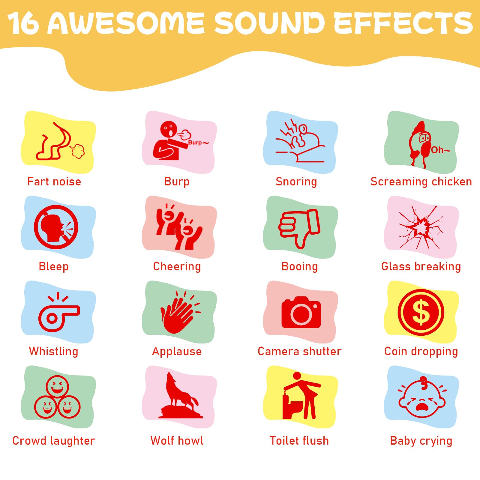 (1)Dieses Prank Soundboard verfügt über 16 Soundeffekte, von lustigen Fürzen und Rülpsern über Jubel und Applaus bis hin zu zerbrechendem Glas. Es eignet sich sehr gut für Streiche, Party-Aufwärmübungen oder lustige Alltagsszenen