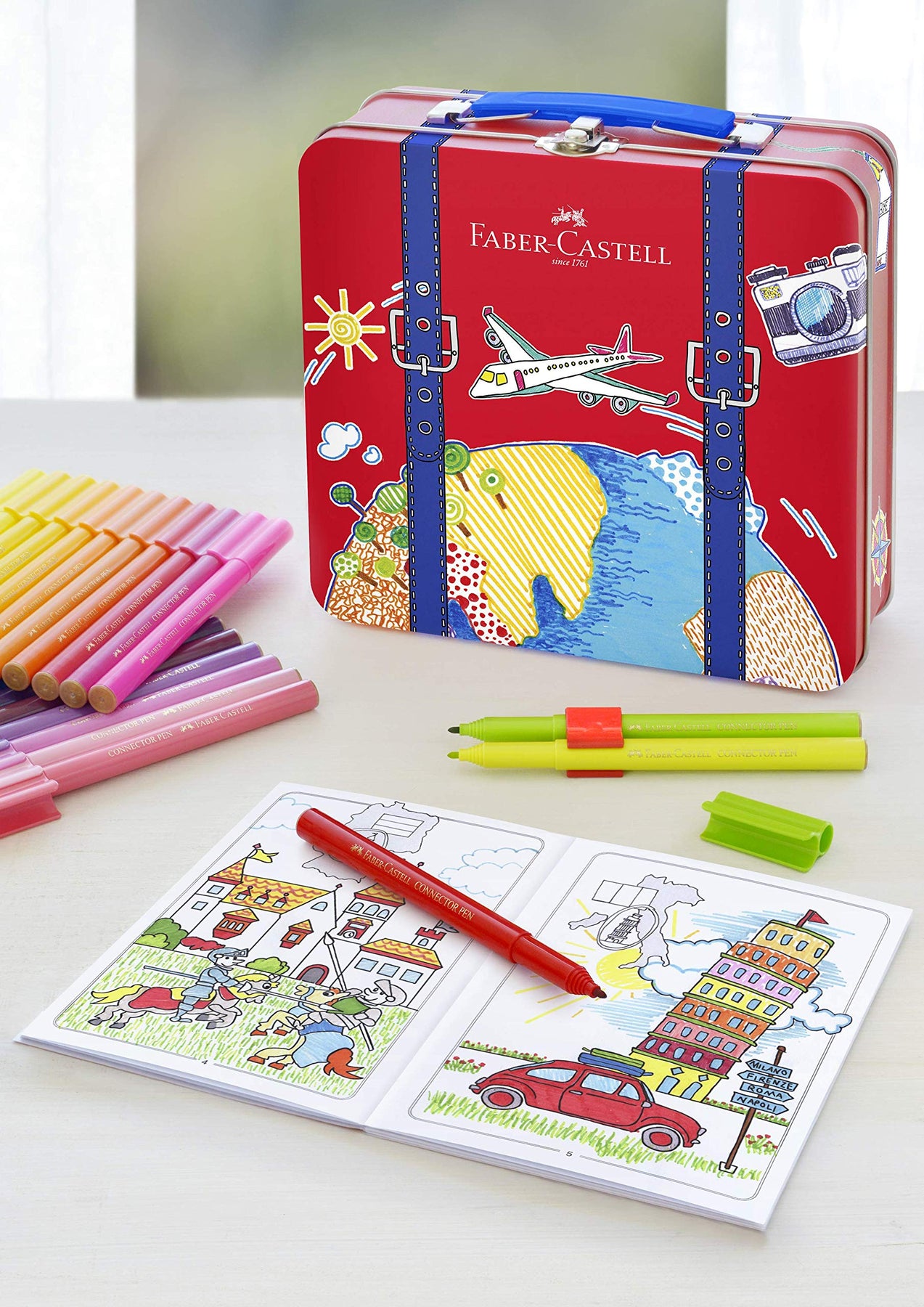 Die Filzstifte Connector "Reisekoffer" von Faber-Castell sind verpackt in einer edlen Metalldose in Kofferoptik. Inklusive Reisepass zum Ausmalen. Der "Reisepass" hat 16 Seiten. Mit 40 Connector Filzstiften in kräftigen Farben. Weitere Artikel finden Sie in unserem Marken Shop. Klicken Sie dazu auf den Markennamen Faber-Castell unterhalb des Produkttitels.