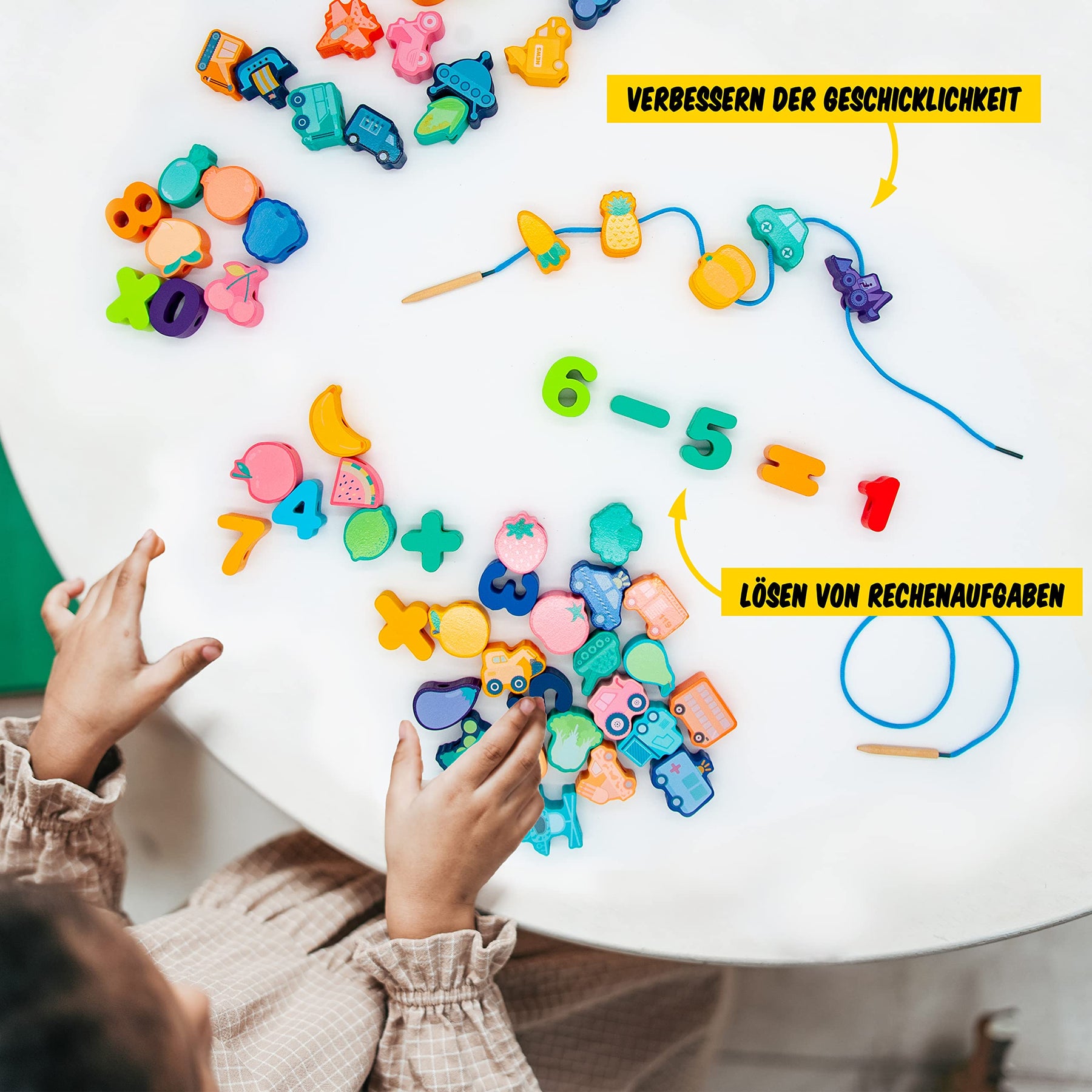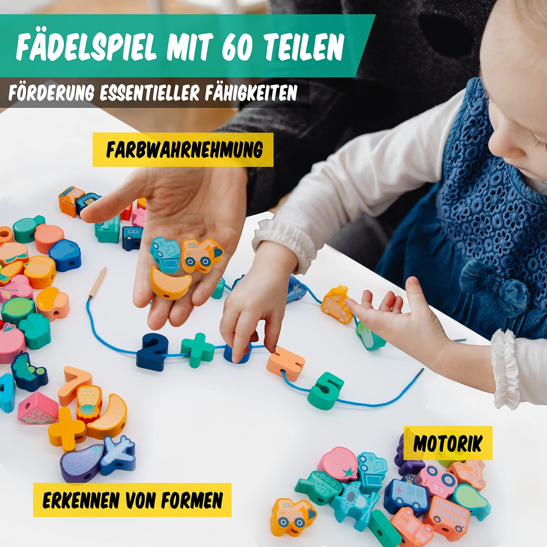 - 🌈 Spielzeug ab 2 Jahre : Unser neues Fädelspiel enthält 60 Perlen (Tiere, Obstgarten, Gemüse und Fahrzeuge) mit deutscher und englischer Übersetzung auf der Rückseite, eine schöne Aufbewahrungsbox und Seile zum Fädeln der Holzperlen. Jede Perle hat ein farbenfrohes Muster - welche die Blicke und das Interesse schnell auf sich zieht.