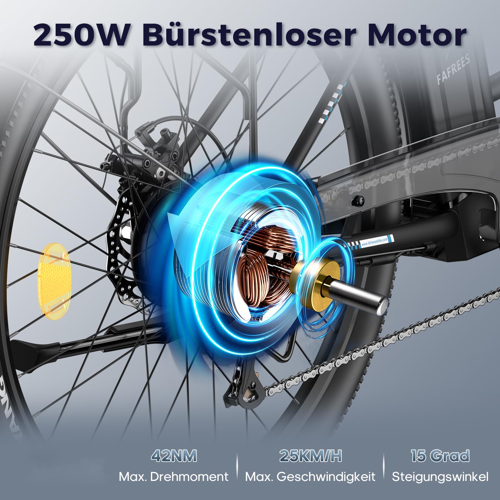 - Leistungsstarker Motor: Ausgestattet mit einem 250W Heckantriebsmotor, erreicht unser e-Bike mühelos eine maximale Geschwindigkeit von 25 km/h und ein maximales Drehmoment von 42 N.m, sodass Sie jede Steigung problemlos meistern können.
