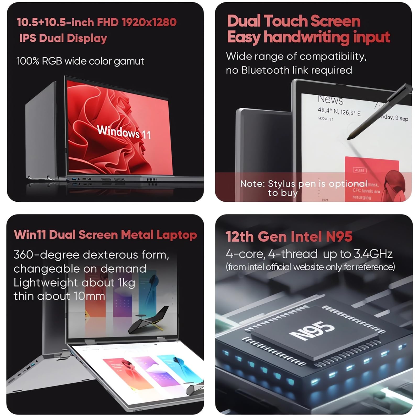 • Leistungsstarker Prozessor: Dieser Laptop mit zwei Bildschirmen verwendet einen N95-Chip mit 4 Kernen und 4 Threads mit L3-Cache von 6 m bis zu 3,4 GHz. Eine solche leistungsstarke Leistung kann die meisten Unterhaltungs- oder Büroanforderungen des täglichen Lebens erfüllen. Spielen Sie einfach 3a Spiele, erstellen Sie Bilder, Ps-Designs und vieles mehr für eine höhere Produktivität.