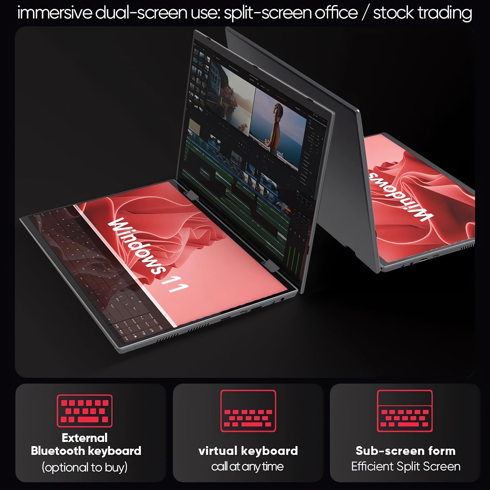 • Kreatives Design mit Doppelbildschirm: Zwei 10,5 Zoll (25,7 cm) große Touch-Laptops mit einer HD-Auflösung von 1920 x 1280 für ein immersives und realistisches Spielerlebnis. Beide Bildschirme können gleichzeitig verwendet werden, der Hauptbildschirm für die Büroarbeit und der Sekundärbildschirm zum Ansehen von Videos. Alternativ können Sie auch einen Kaskadenbildschirm erleben, während Sie im Internet surfen. Es erfüllt die vielfältigen Anwendungen einer Maschine.