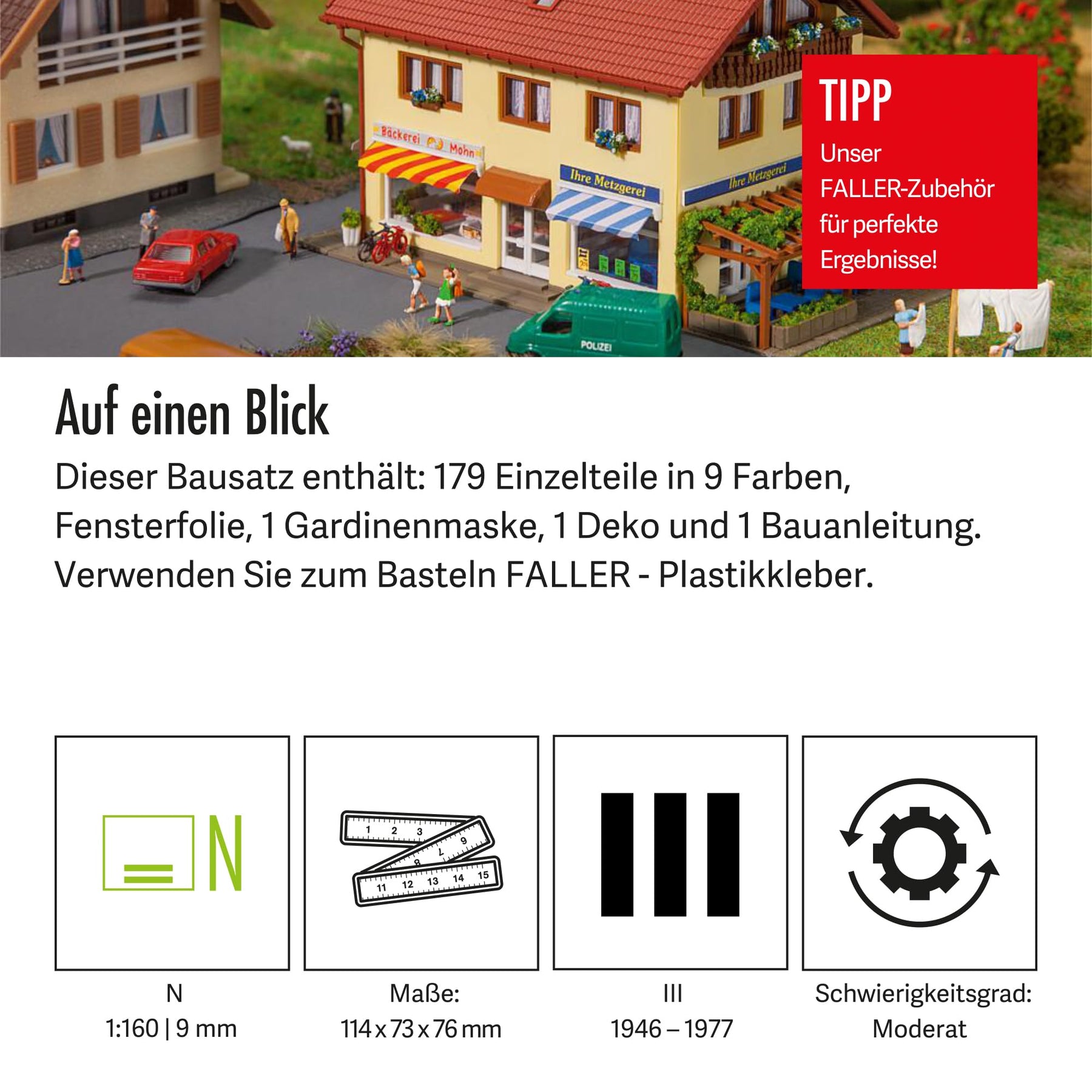 Dieser Bausatz enthält: 179 Einzelteile in 9 Farben, Fensterfolie, 1 Gardinenmaske, 1 Deko und 1 Bauanleitung. Verwenden Sie zum Basteln FALLER - Plastikkleber.
