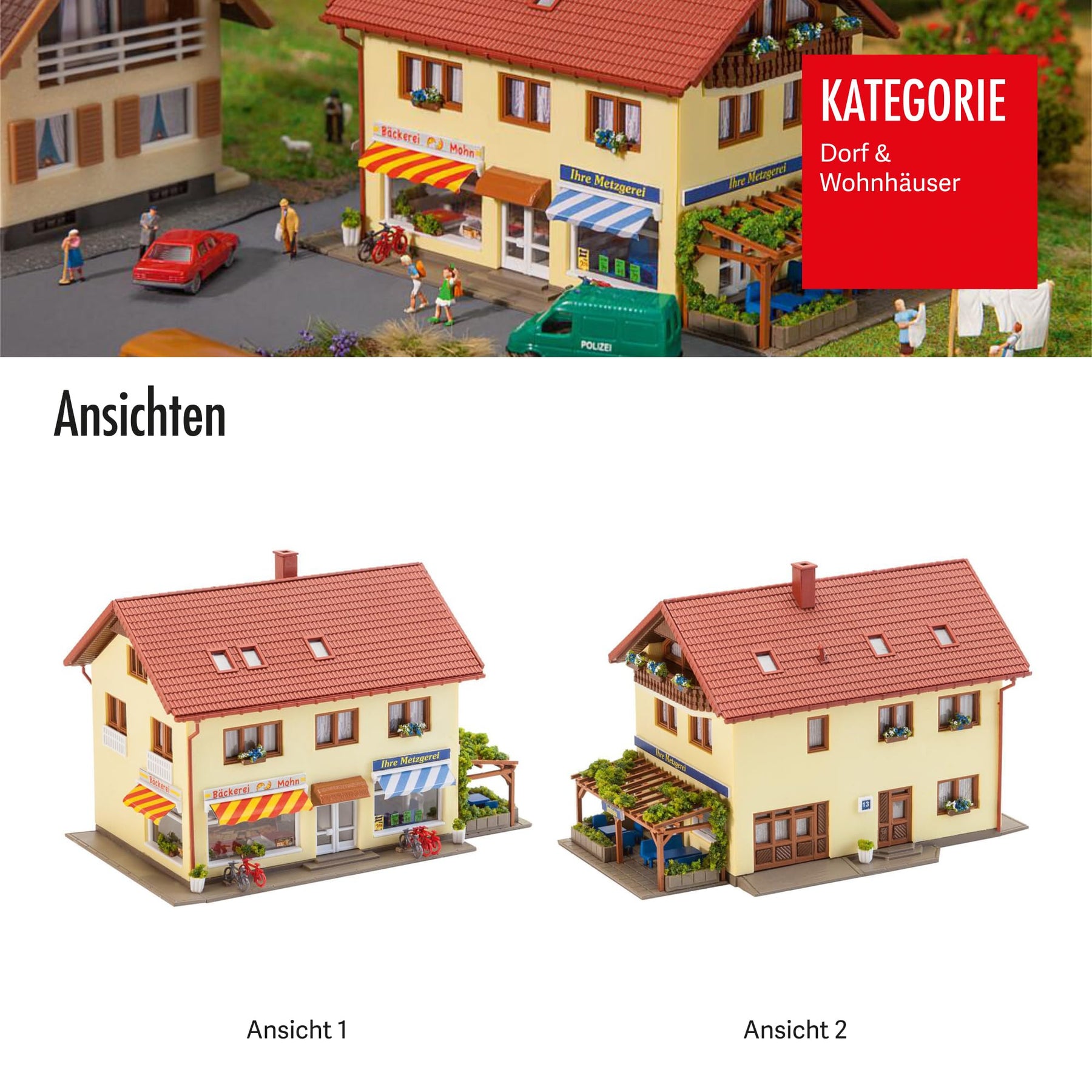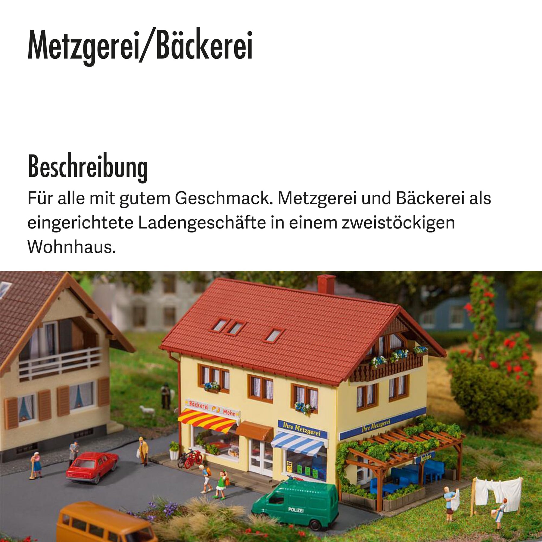 Für alle mit gutem Geschmack. Metzgerei und Bäckerei als eingerichtete Ladengeschäfte in einem zweistöckigen Wohnhaus. Durch die großen Schaufenster erblickt man die Warenauslage und ein Snack am Stehtisch unter der berankten Pergola lädt zum kurzen Zwischenstopp ein. Zum Zubehör gehören zudem Fahrräder und passende Fahrradständer. Abmessung: 114 x 73 x 76 mm, Epoche I