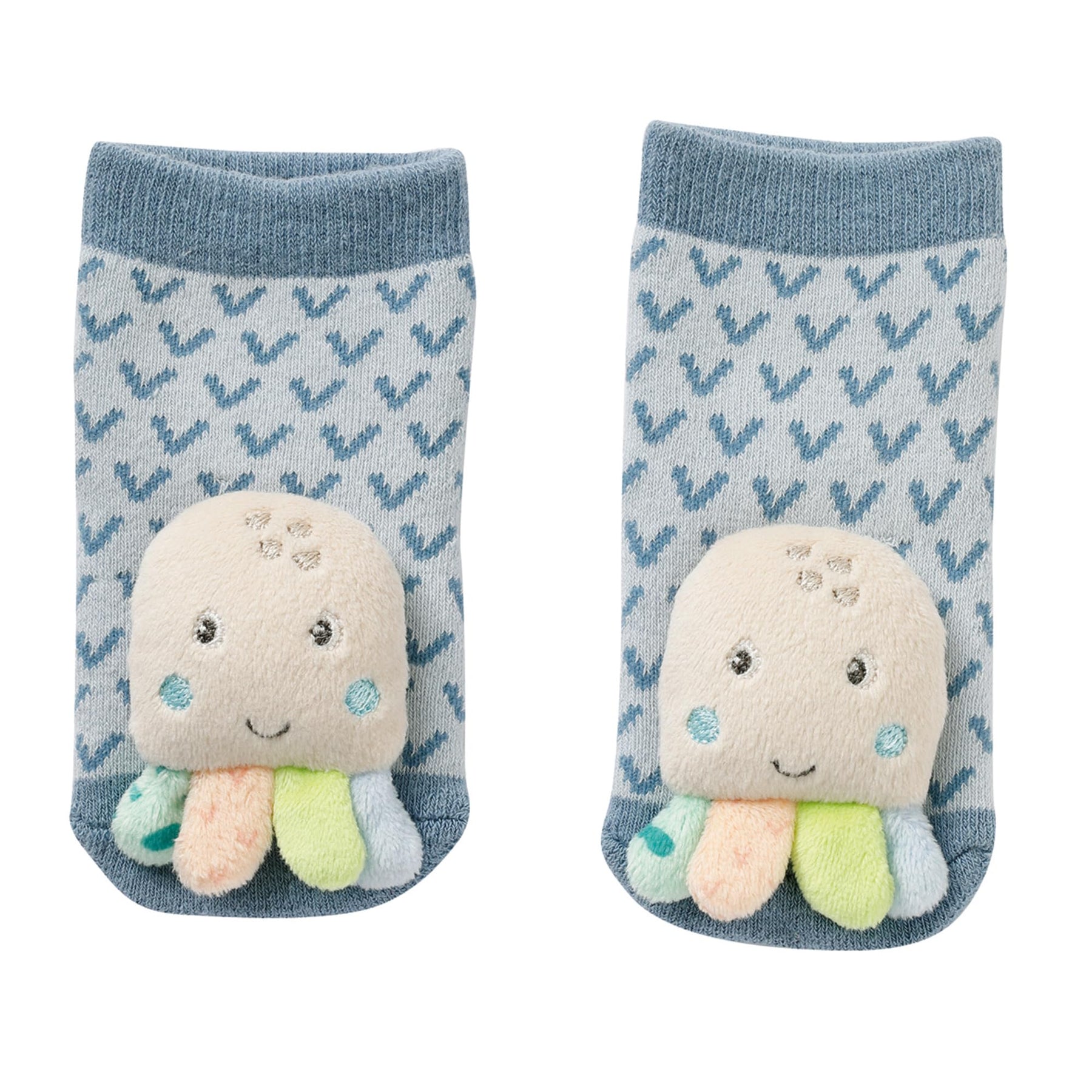 Die Rasselsöckchen im süßen Oktopus-Design überzeugen doppelt: Ihr weiches Material hält empfindliche Babyfüße kuschelig warm und