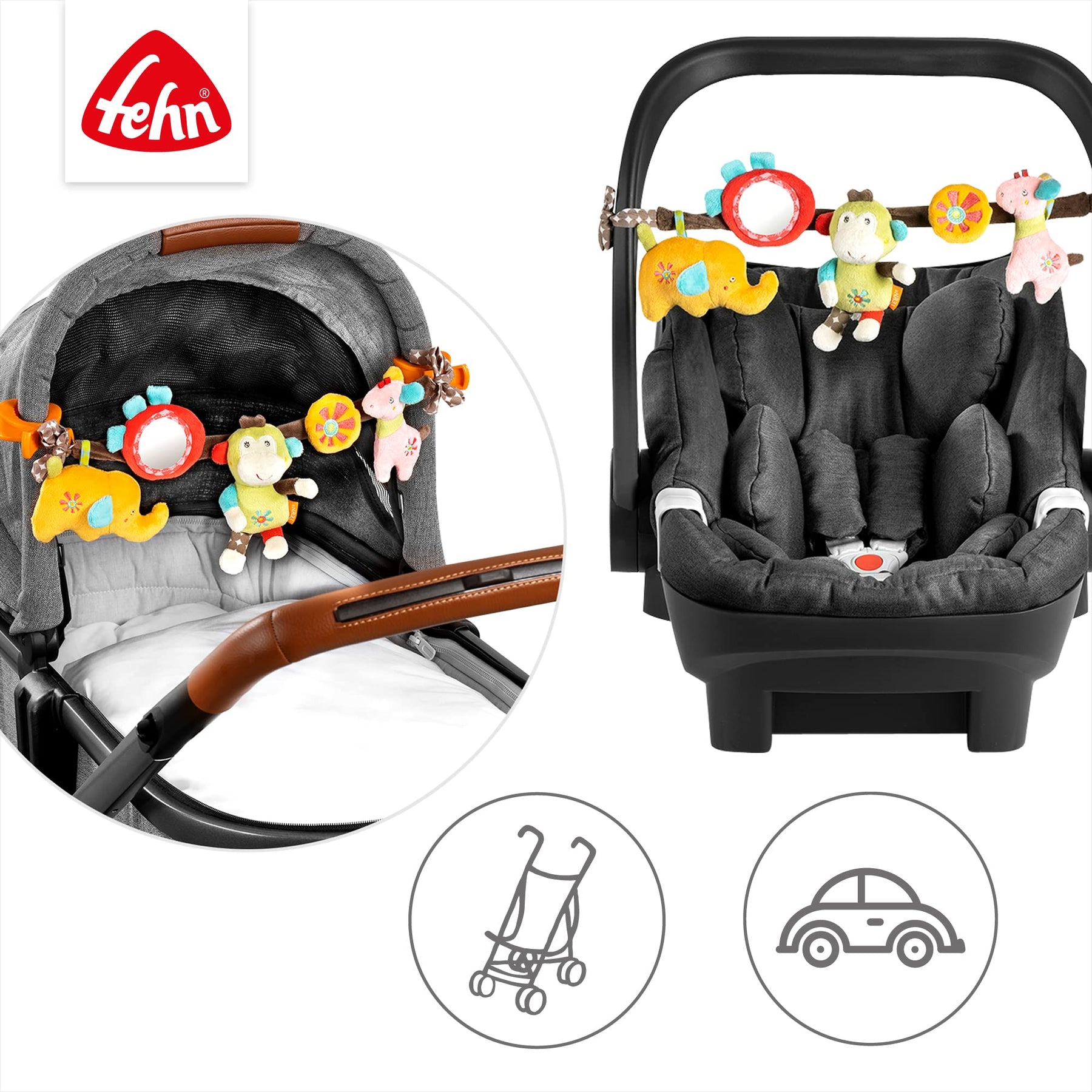 Fehn Kinderwagenkette Spielzeug Safari – Baby Mobile Kette mit niedlichen Figuren zum Aufhängen an Kinderwagen, Babyschale oder Kinderbett – Kinderwagen Zubehör für Babys und Kinder ab 0+ Monaten