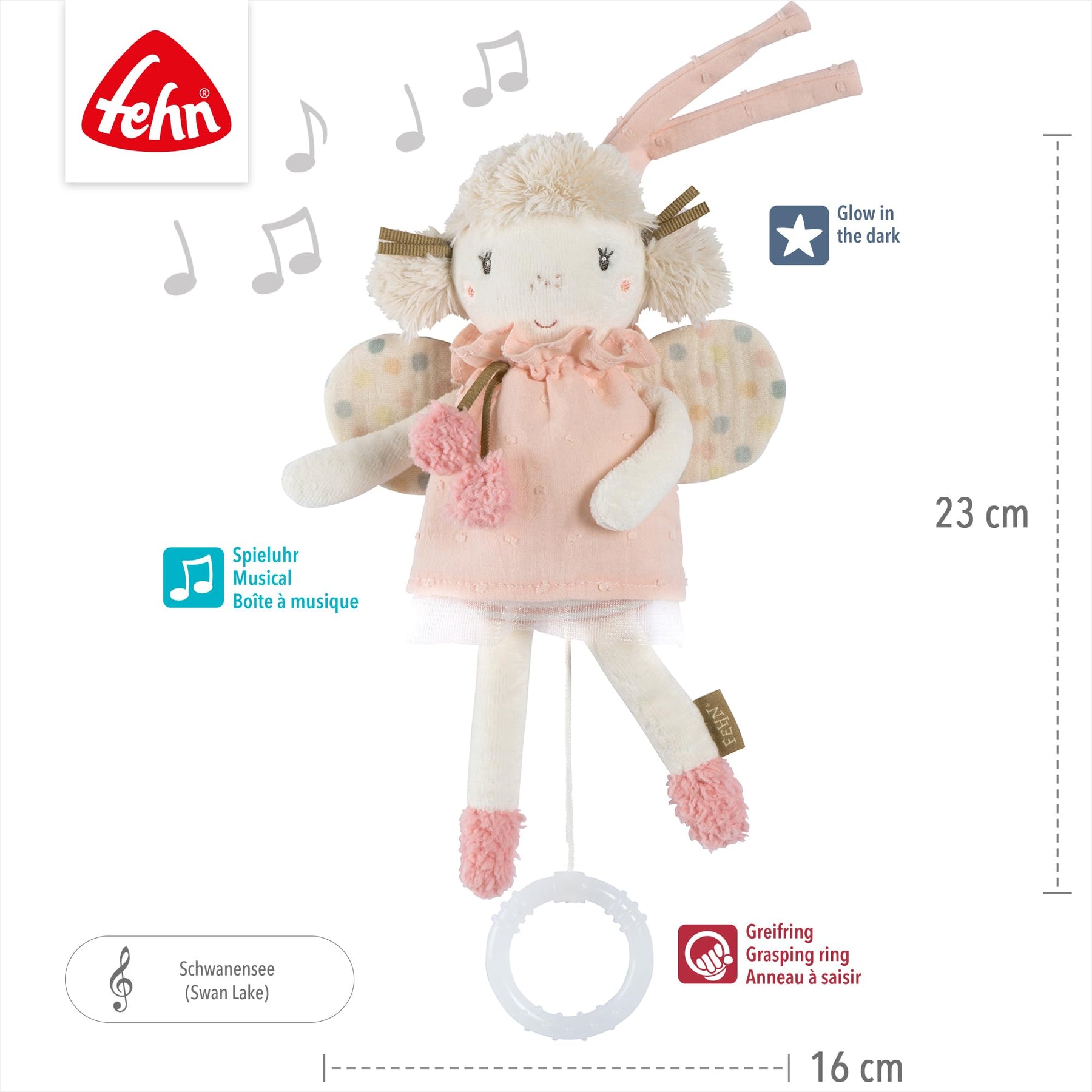Einzelheiten: Die niedliche Fee aus der feehnLAND Kollektion ist nicht nur eine treue Begleiterin. In ihrem zauberhaften Kleid und zarten Farben tröstet und beruhigt sie, mit ihrer sanften Einschlafmelodie "Schwanensee"! Die „Glow-in-the-dark“ Bestickung leuchtet im Dunkeln und beruhigt beim Einschlafen. Durch die praktische Größe und die Befestigungsbändchen kann man die kleine Fee überall hin mitnehmen. Fühlen, Knuddeln und Liebhaben: Ganz schnell wird die zauberhafte Fee zu Babys bester Freundin! --- mit integriertem und herausnehmbarem Spielwerk zum Aufziehen / Melodie: Schwanensee / Spieldauer ca. 1,5 - 2 Minuten / Spieluhr vor dem Waschen entnehmen / Betätigen des Reißverschlusses nur durch Erwachsene / aus der feehnLAND Kollektion / ideal als Geschenk zur Geburt, Taufe oder als Geburtstagsgeschenk für Babys und Kleinkinder / von unabhängigen Testinstituten auf Sicherheit geprüft
