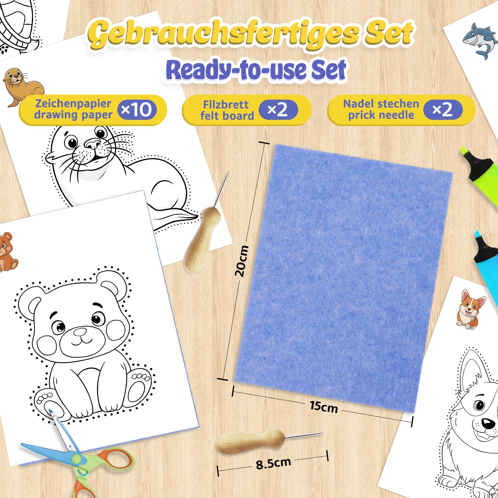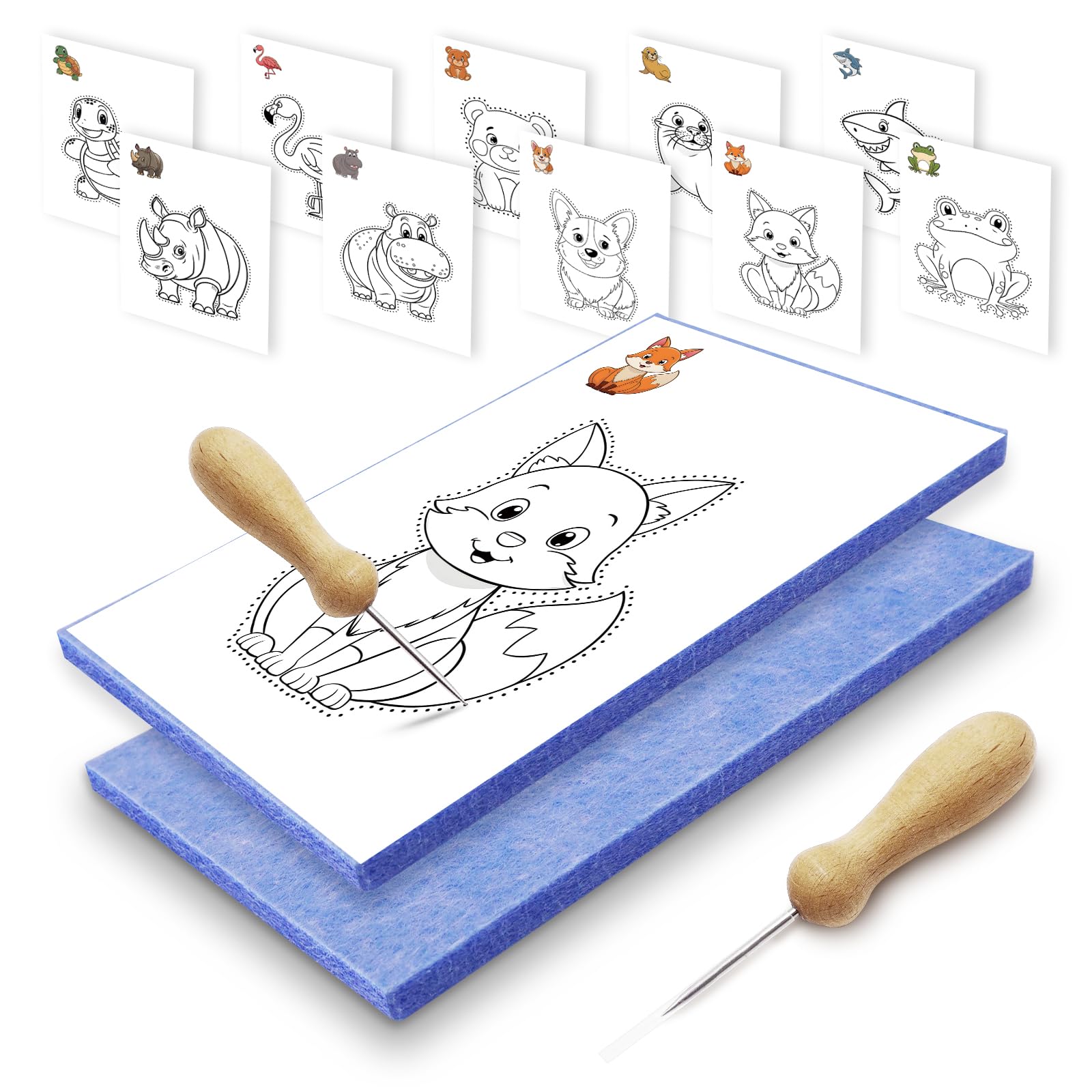 Fettwal Prickelnadel Set Kinder, Prickelset Stickbilder Sticken für Kinder ab 3, mit 2 Prickelnadel 2 Prickelfilz 10 Stickbilder, Verwendung unter Aufsicht der Eltern (Tierthema)