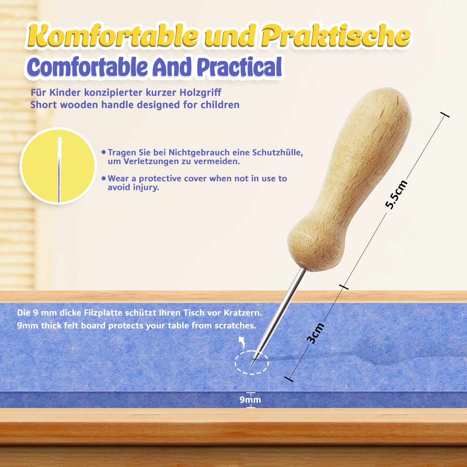 • Einzigartiges und sicheres Design: Für die Sicherheit und Zuverlässigkeit des Produkts haben wir die Länge des Prickelnadel auf 8.5 cm, die Nadellänge auf nur 3 cm und die Grifflänge auf 5.5 cm reduziert(Entwickelt für Kleine Hände). Dies gewährleistet sowohl die Produktverfügbarkeit als auch die Produktsicherheit.