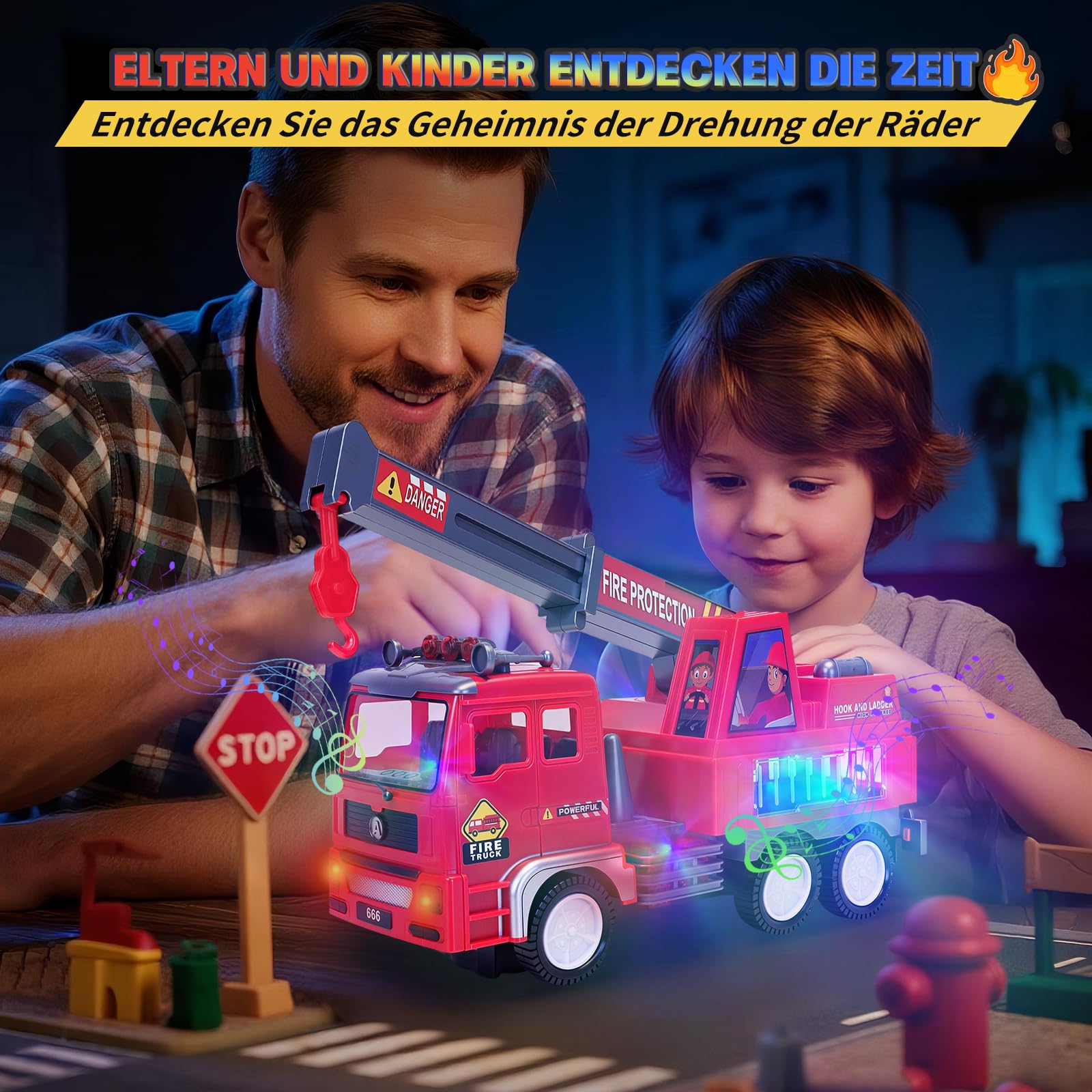 Feuerwehrauto Spielzeug für Kleinkinder ab 3 4 5 Jahren, 4D LED Licht Feuerwehr Spielzeug, Drehbare, Hindernisse vermeidende Groß Elektrisch Feuerwehrfahrzeuge, Geschenk für Kinder Jungs Mädchen