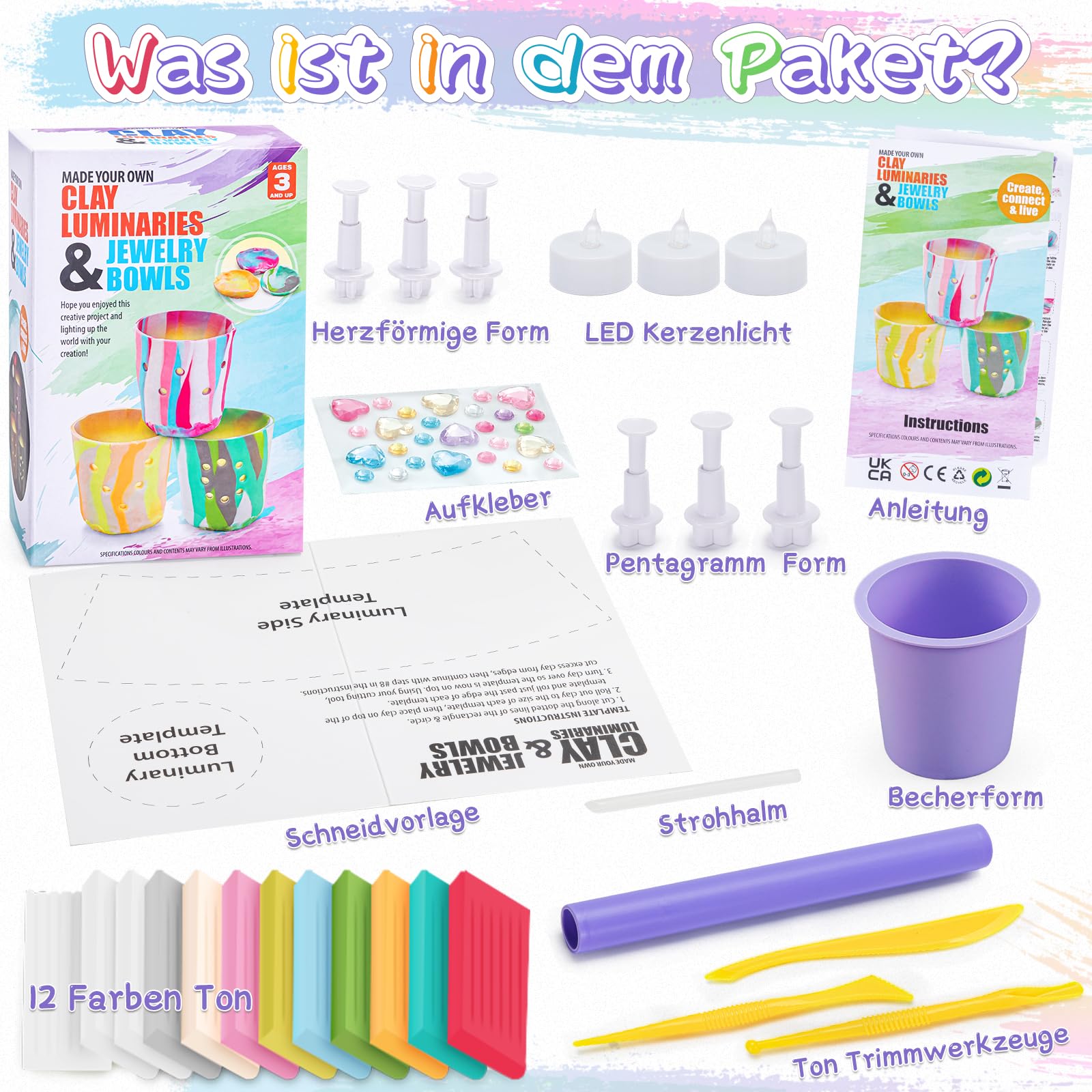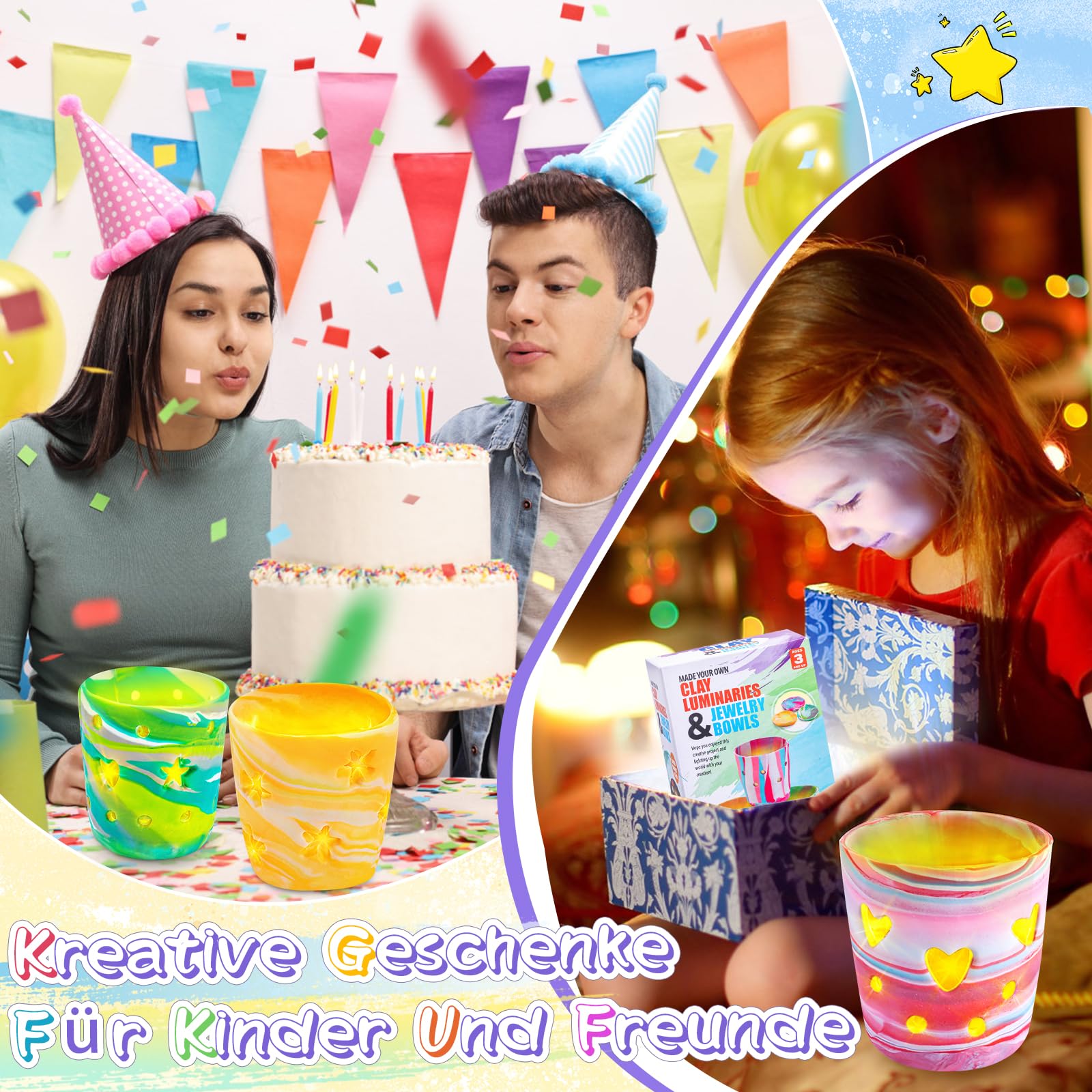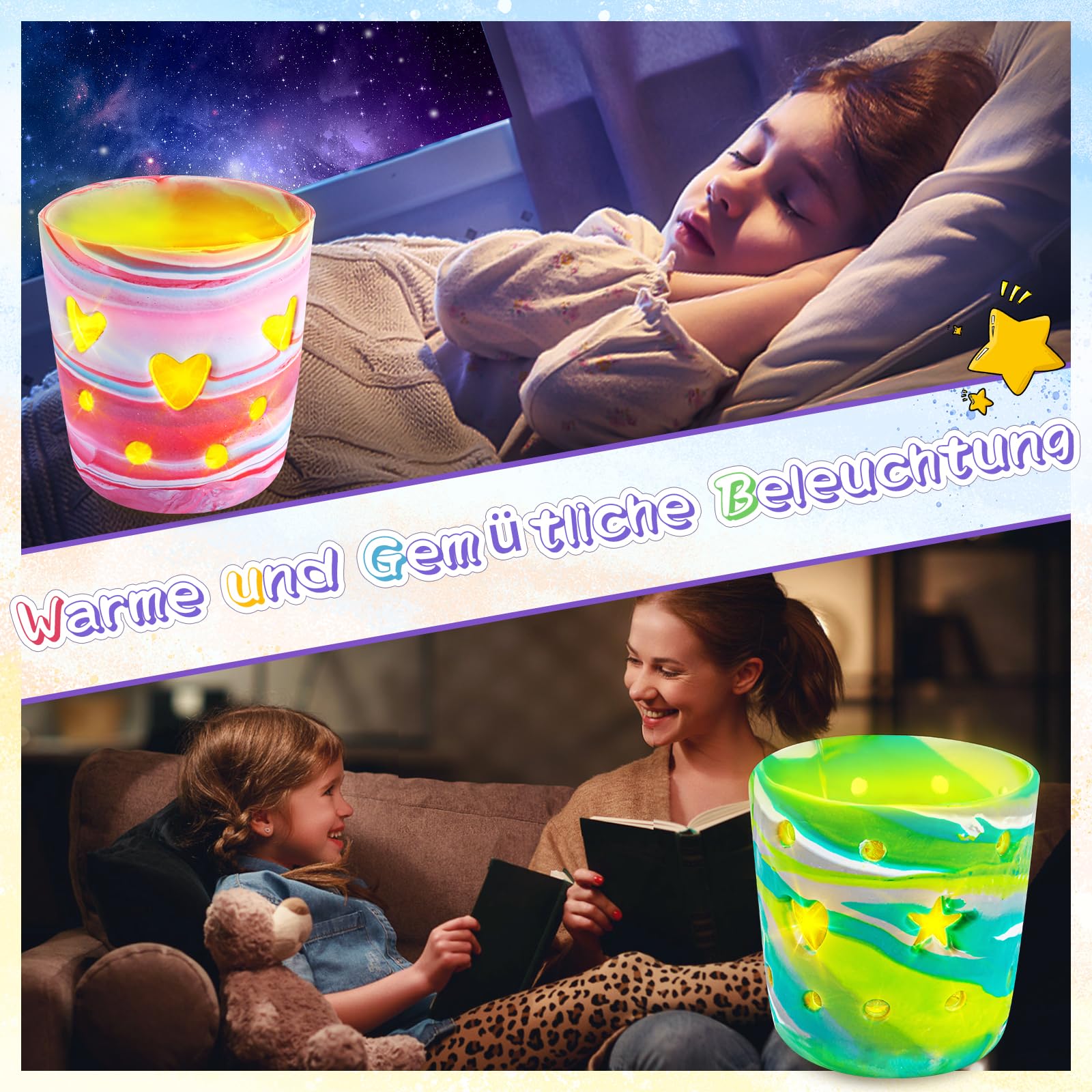 - Exquisites & Einzigartiges Bastelset: Der Ton in den bastelsets für kinder kann gemischt werden, um wunderschöne Marmor-Muster zu erstellen und zu einzigartigen Kerzenlampen geformt zu werden. Diy set kinder kann verwendet werden, um ein schönes Zimmer zu dekorieren, eine warme und gemütliche Kerzenlichtatmosphäre zu schaffen und Sie zu entspannen!