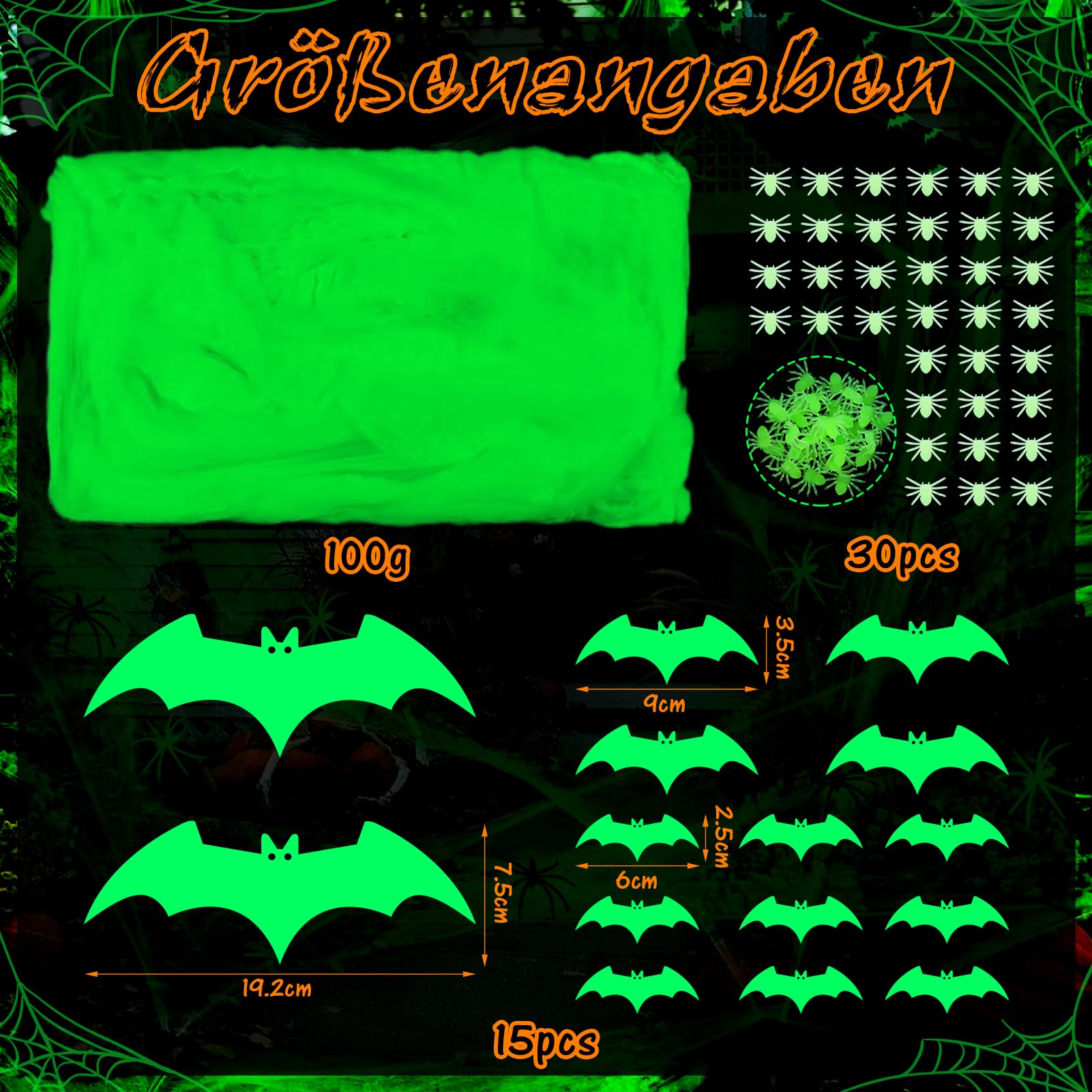 - 👻 Alles in einem Set – Enthält 100 g Spinnennetz, 30 leuchtende Spinnen und 15 3D-Fledermaus-Wandsticker in drei Größen. Die perfekte Kombination für eine rundum gruselige Atmosphäre.
