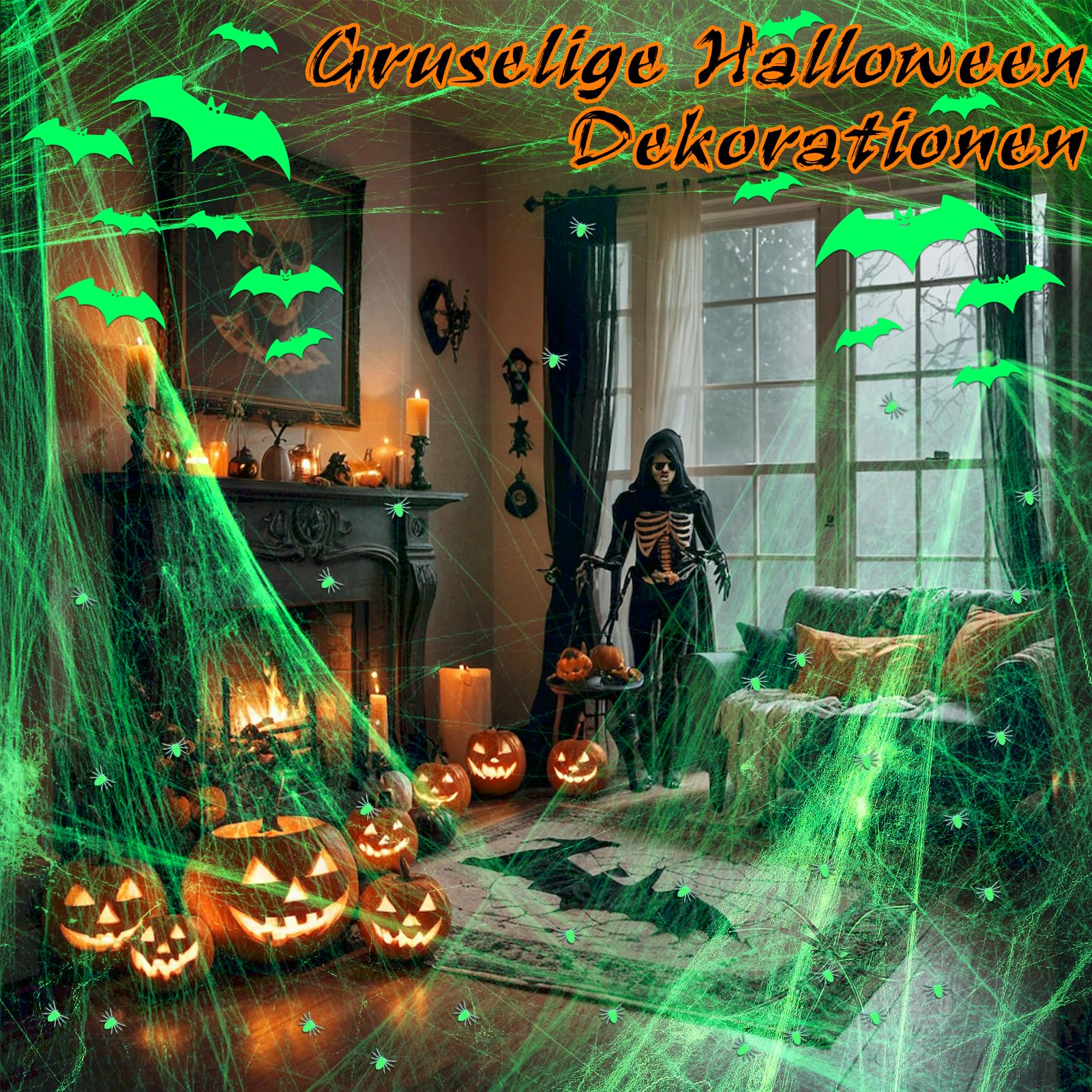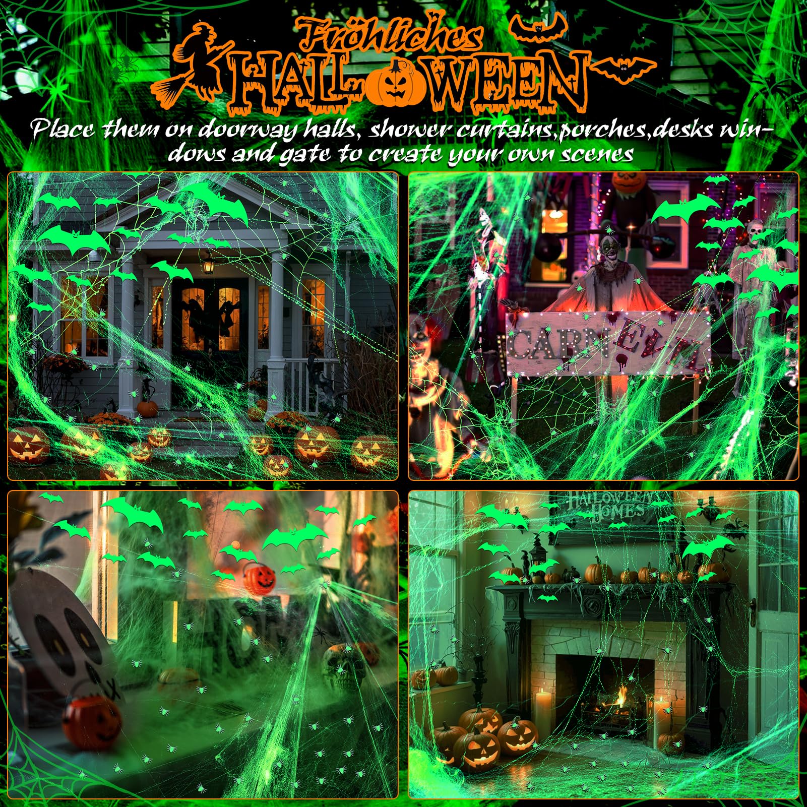- 🕸️ Unheimlich Leuchtend – Das fluoreszierende Spinnennetz ist ein echtes Muss für jede Halloween-Party! Decken Sie Wände, Decken, Möbel oder draußen Büsche und Bäume ab – und lassen Sie Ihr Zuhause im schaurigen Glanz erstrahlen.