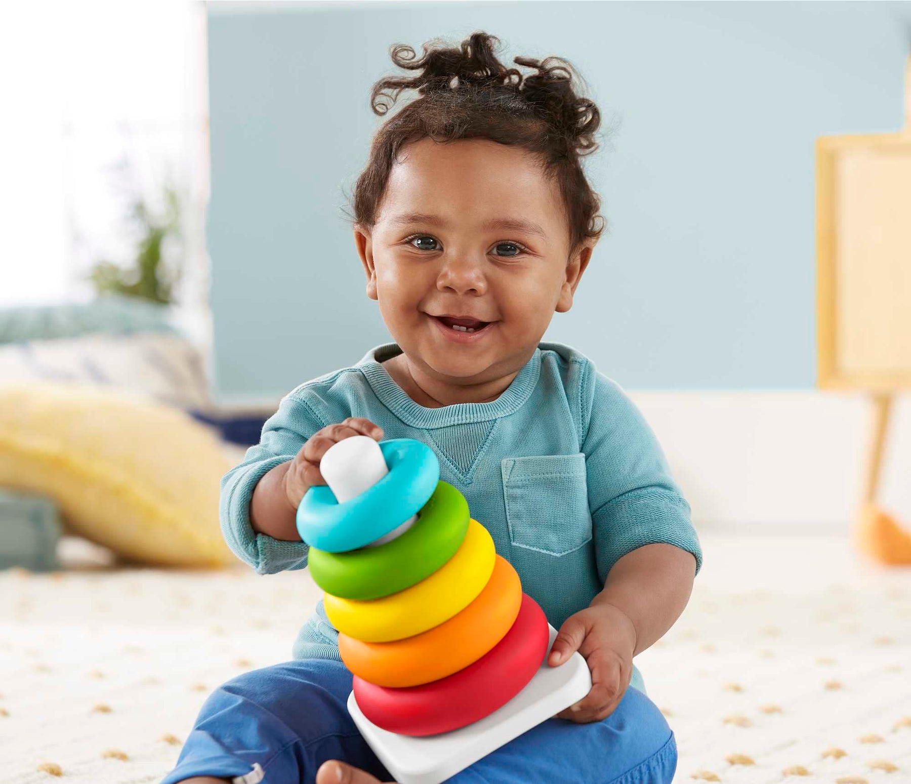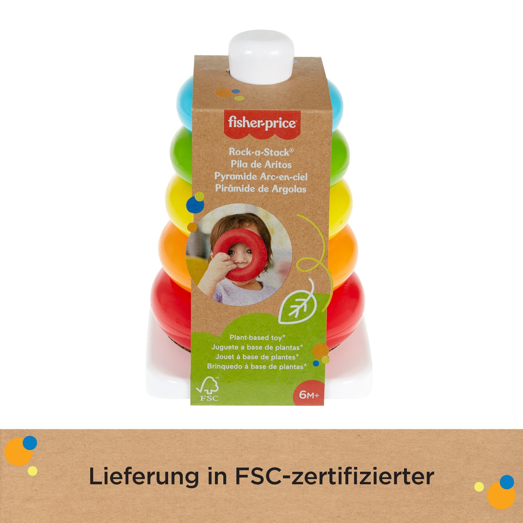 Einzelheiten: Das ultimative Ringspiel. Dieses Fisher-Price Pyramiden-Spielzeug wurde aus Materialien auf Pflanzenbasis hergestellt und bietet Babys reichlich Spaß beim Stapeln. Mit einer Schaukelbasis und 5 bunten Ringen, die kleine Hände gut greifen und stapeln können. Das Aufeinanderstapeln fördert die Auge-Hand-Koordination und bringt dem Baby verschiedene Größen näher, wenn es die kleineren Ringe auf die größeren stapelt! (*Spielzeug aus mindestens 90 % Ethanol hergestellt, das aus Zuckerrohr gewonnen wurde.)