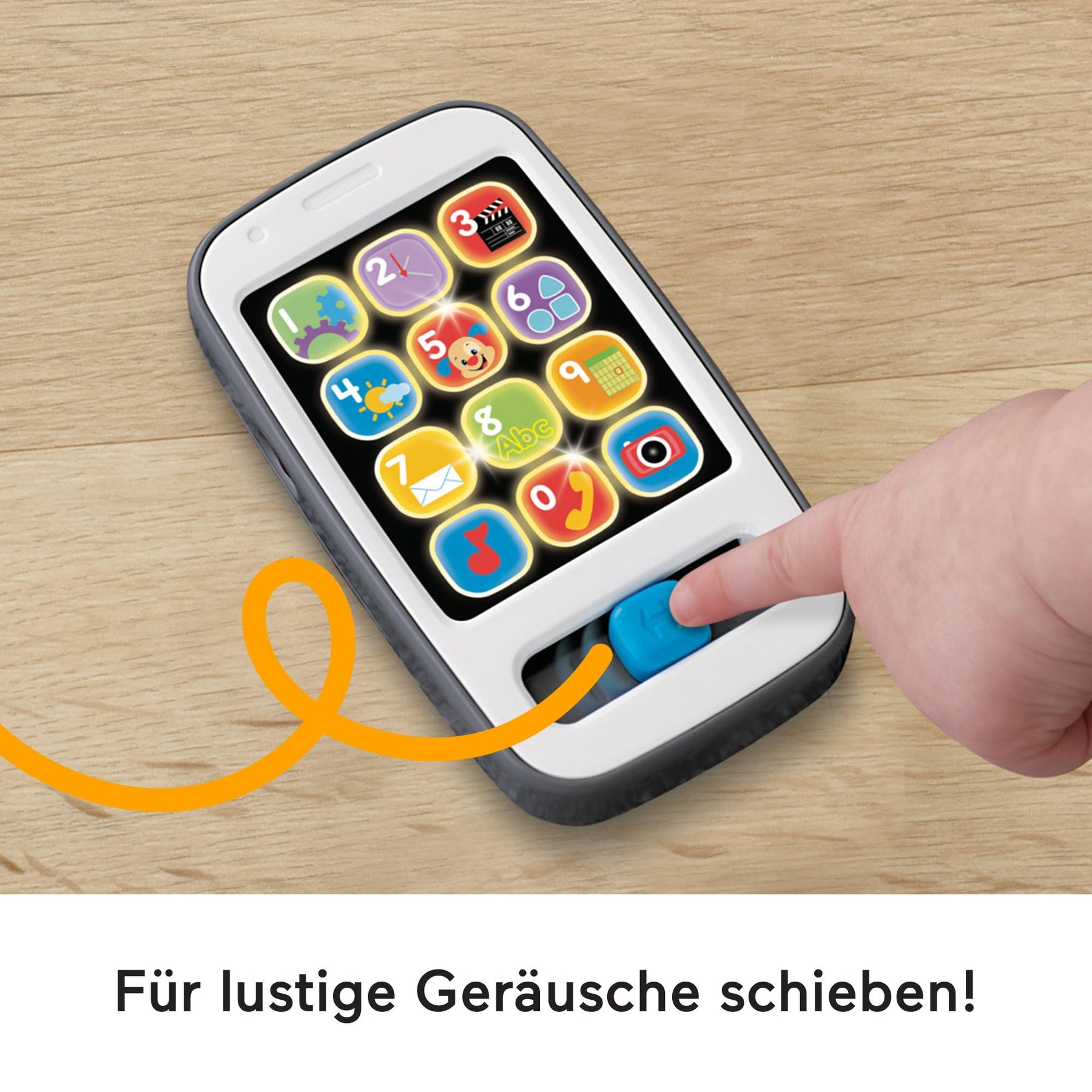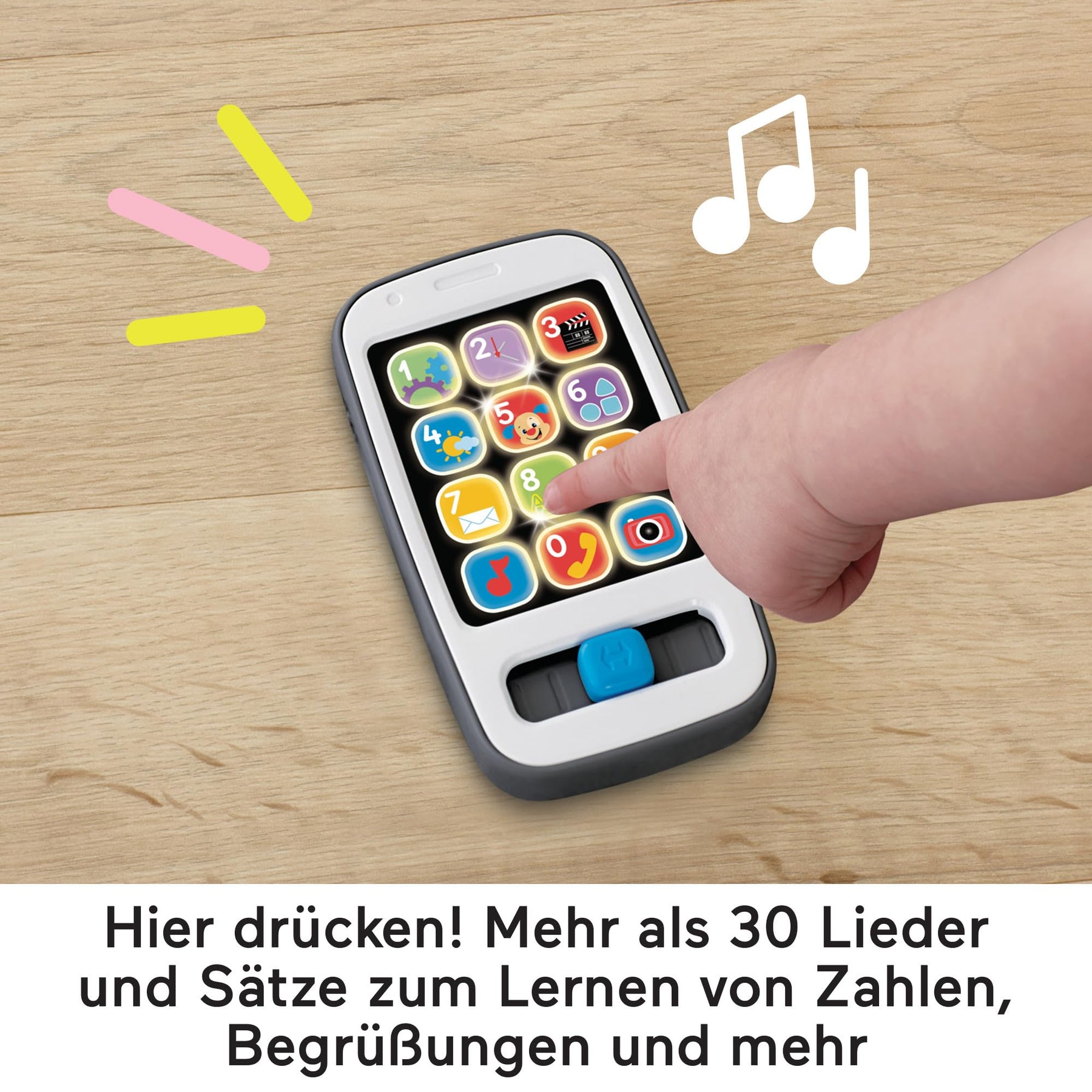 Das Lernspaß Smartphone von Fisher-Price sieht wie ein Smartphone für Erwachsene aus und hat die perfekte Größe für kleine Kinderhände zum Greifen und Entdecken für anregenden Lernspaß. Es gibt 12 App“-Tasten. Durch Drücken können bunte Lichter und mehr als 30 Lieder, Geräusche und Sätze aktiviert werden, durch die Kinder Zahlen, Zählen, Begrüßungen und mehr lernen können. Zur Förderung der Feinmotorik können Kleinkinder den Schieberegler vor und zurück schieben und weitere Geräusche aktivieren.